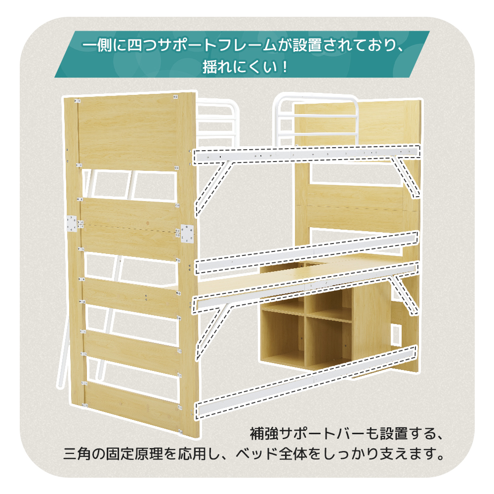 • 【斜め掛けハシゴ 上り下りラクラク】毎日上り下がりする際の快適さも、しっかりとこだわりました。また、底面にはゴム製の球体キャップをお取り付けしております、上り下がりする際に体重がかかっても滑りにくく、床面も傷つけにくい仕様に。ハシゴの耐荷重:150kg左右選べる!ハシゴ位置