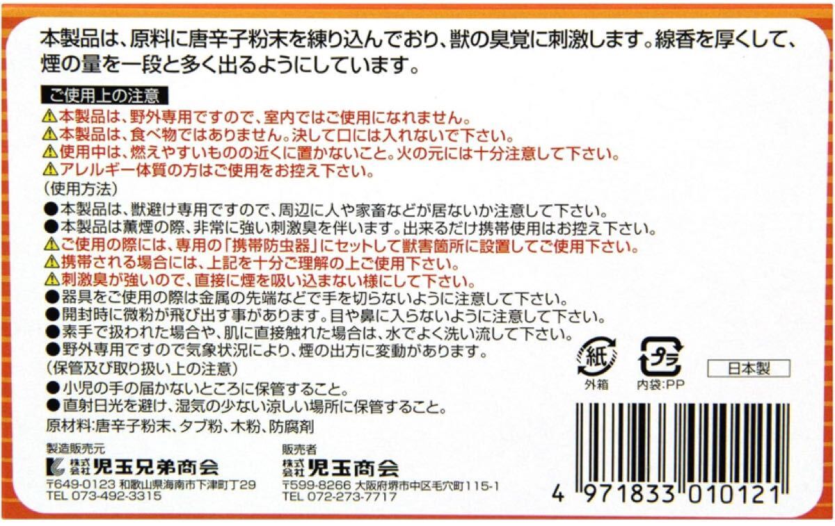 素材:唐辛子粉末 タブ粉 木粉 防腐剤、有効成分:トウガラシ成分