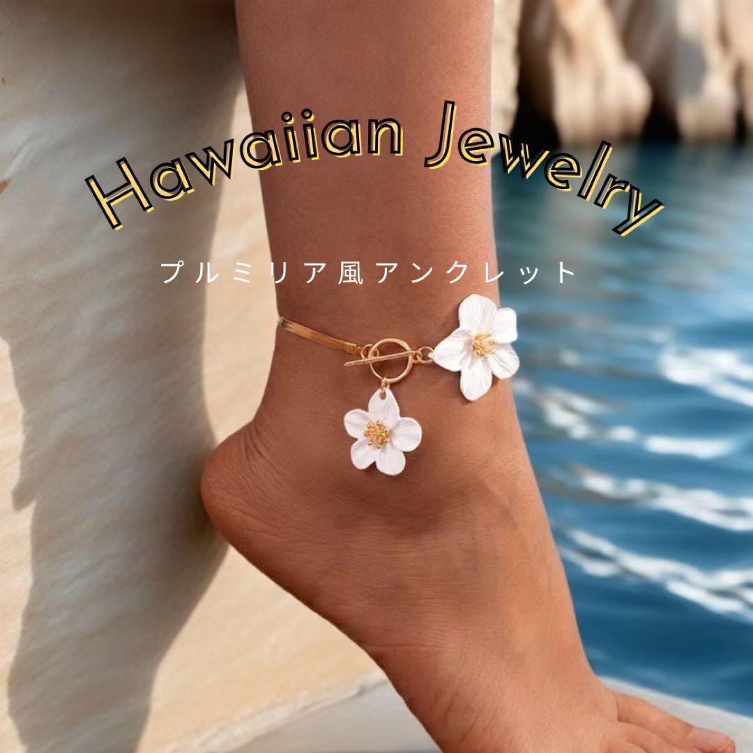 上品なゴールドチェーンに、可憐なプルメリア風チャームをあしらったハワイアンテイストのアンクレット。