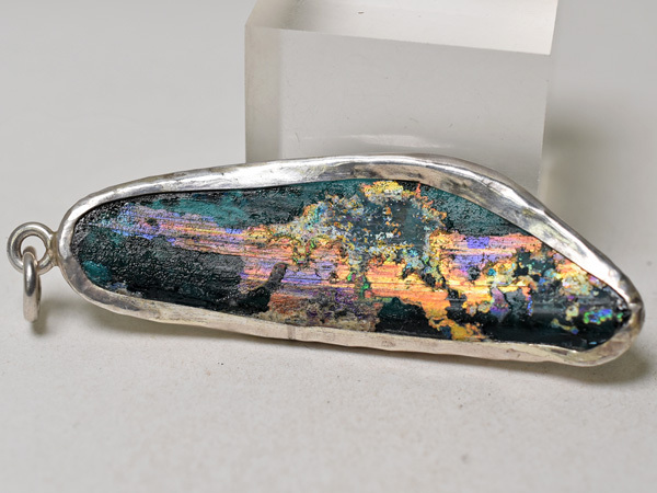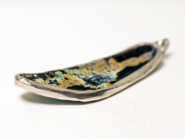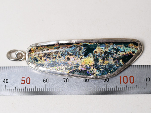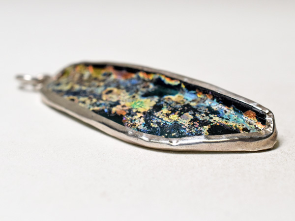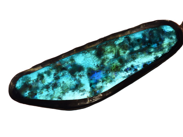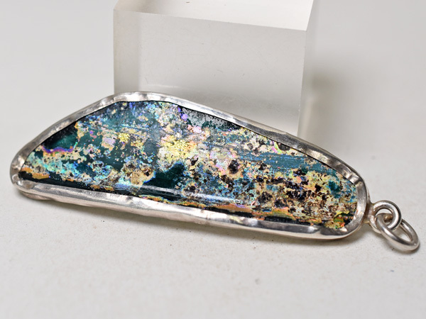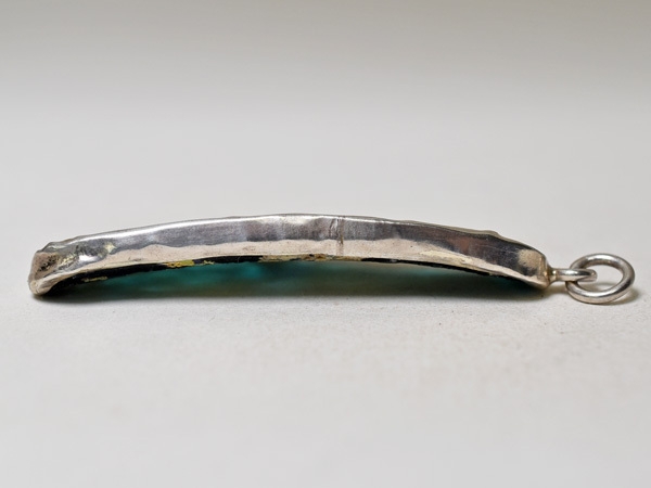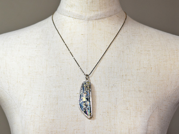 両面に神秘的な銀化が見られる、セミクリアブルーの古代ローマンガラス器の残欠片ペンダントヘッドです。優雅で美しい銀化の輝きは大変神秘的で、人間と自然が作った、2000年の時を経た神秘をお楽しみいただけます。銀化は角度を変えることにより多彩な表情を見せてくれます。92.5%のカレンシルバーで囲ってあり丸環も装着していますので、チェーン等に通せばすぐにTOPとしてお使いいただける他、コレクションとしても是非ご検討下さい。写真のチェーンは付属していません。