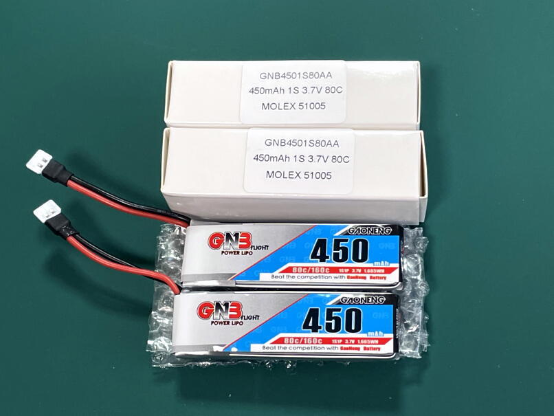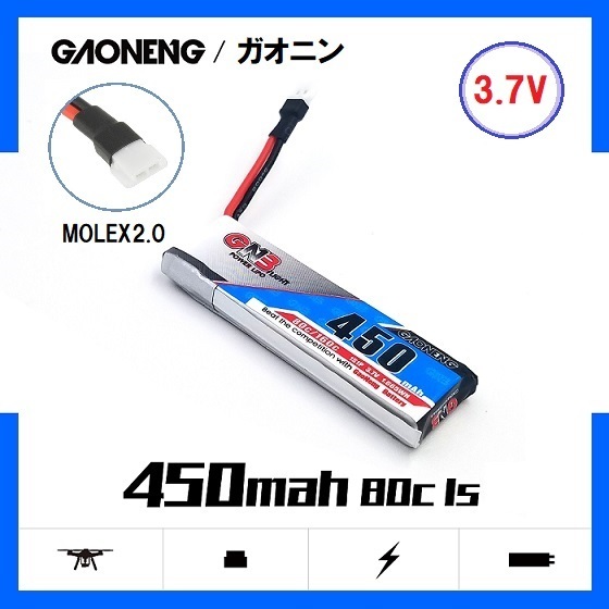 ●GNB(GaoNeng Battery) 1S 3.7V450mAh 80-160C Molex51005コネクター仕様 一般普及型充電器使用4.2V充電 ハイパワー出力です。充電コードはネオヘリ特注の全長5㎝でK110Sなどに使用しやすいです。一般のショップで販売しているこのリポはミニドローン用で充電コードは約2㎝くらいで短くK110などで使用している間にバッテリー内部のはんだ付けが断線しやすいです。このリポはMolex51005タイプのプラグ付きです。K110、V977、MiniCPなどマイクロヘリ、小型ドローン、軽量小型飛行機用です。