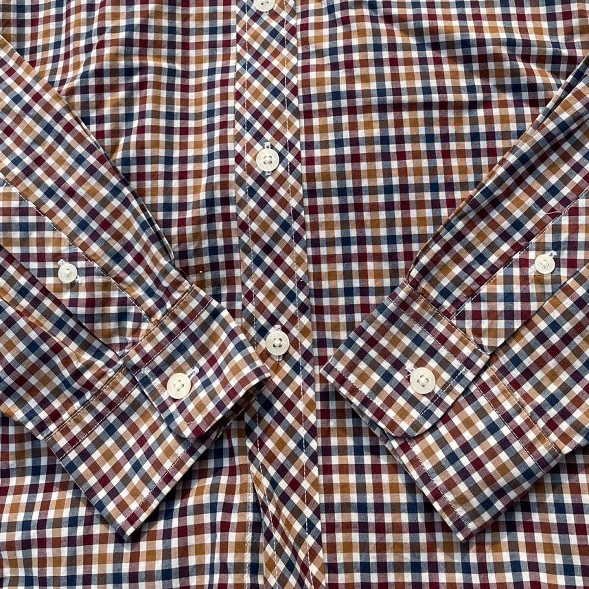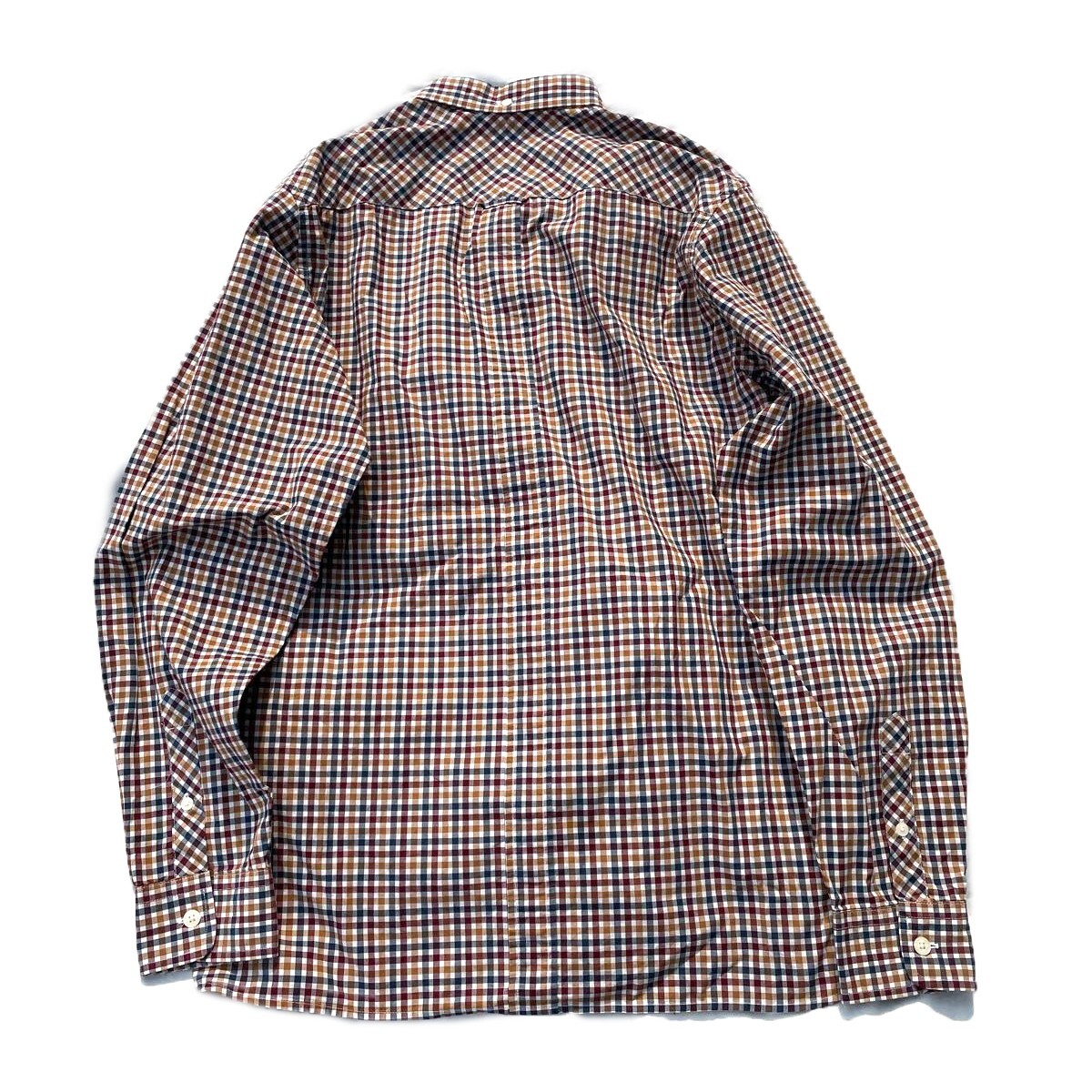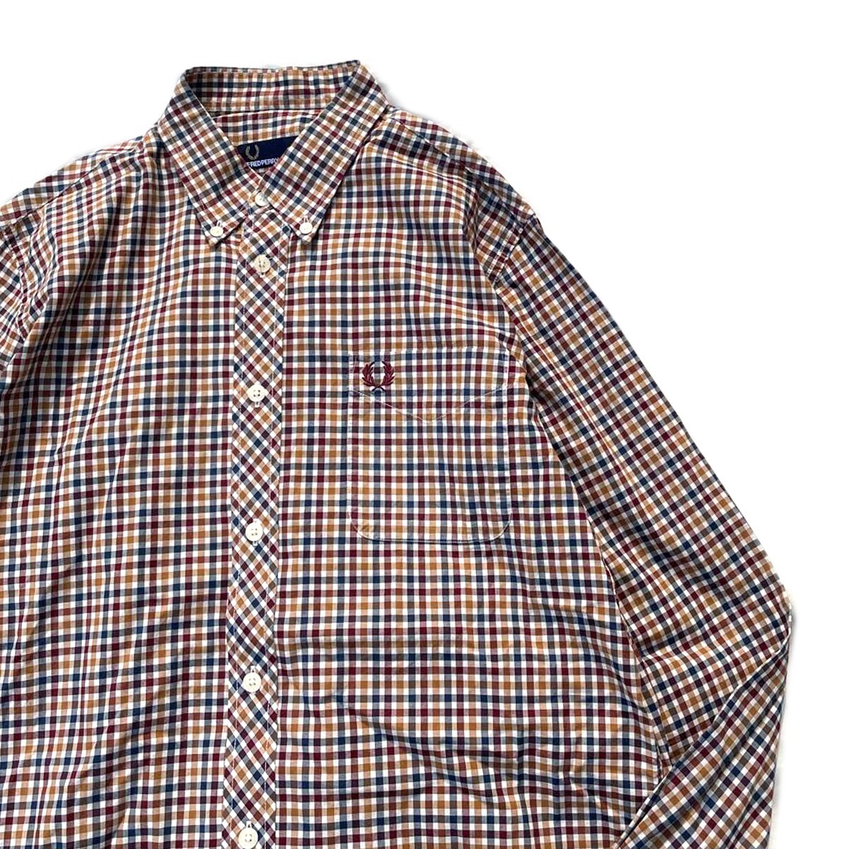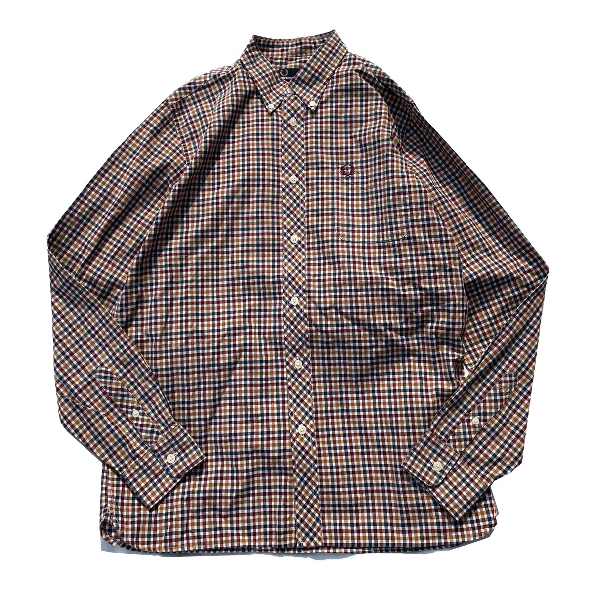 モッズスタイル! Fred Perry フレッドペリー 月桂樹 ロゴ ギンガムチェック柄 ボタンダウン 長袖シャツ エンジ色 ベージュ 紺 白 M メンズ