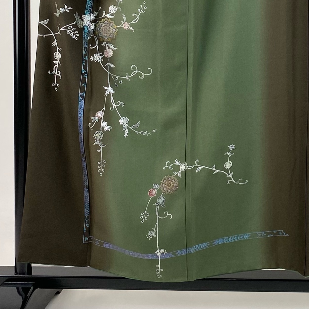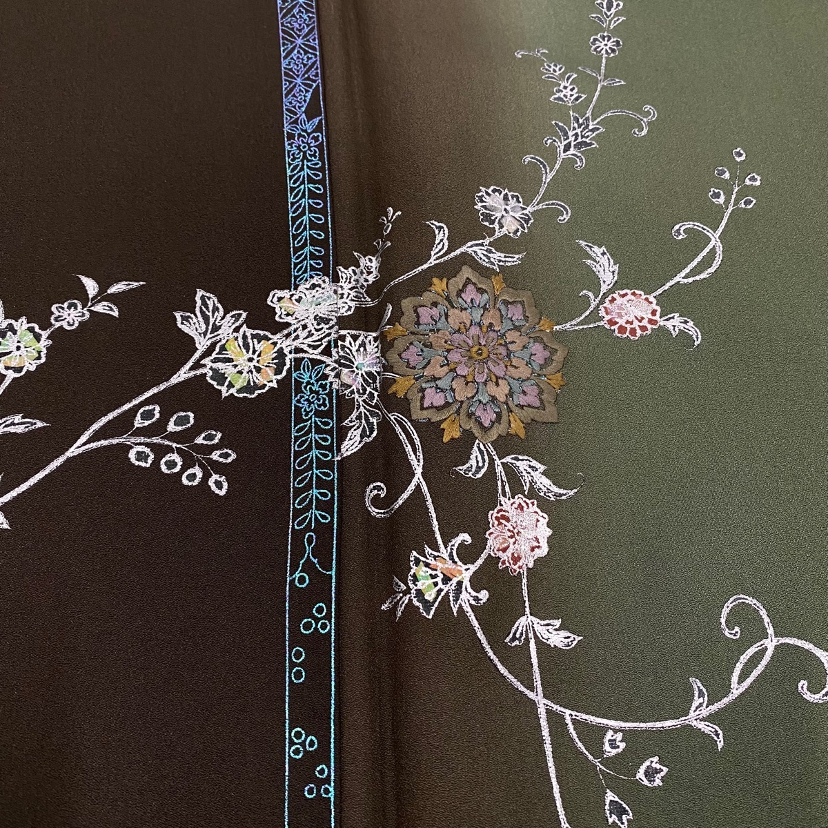 付下げ 秀品 華文 花唐草 刺繍 銀彩 焦茶色 袷 身丈157 裄丈64 M 正絹 【中古】 |