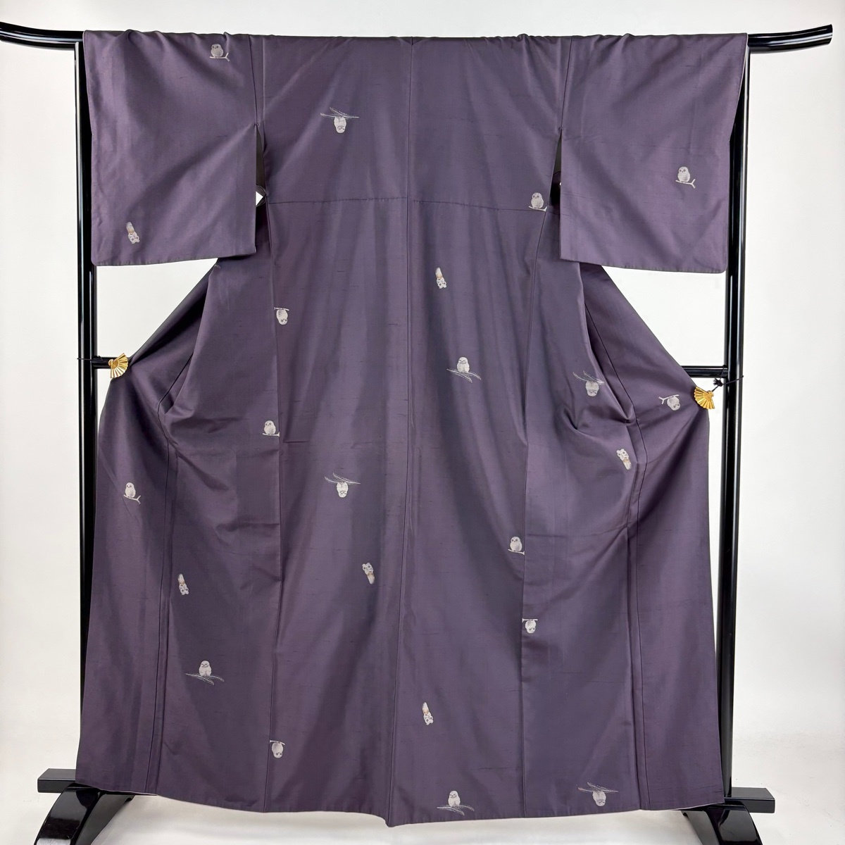 | 小紋 名品 紬地 ふくろう みみずく 灰紫 袷 身丈162.5 裄丈66 M 正絹 【中古】 |