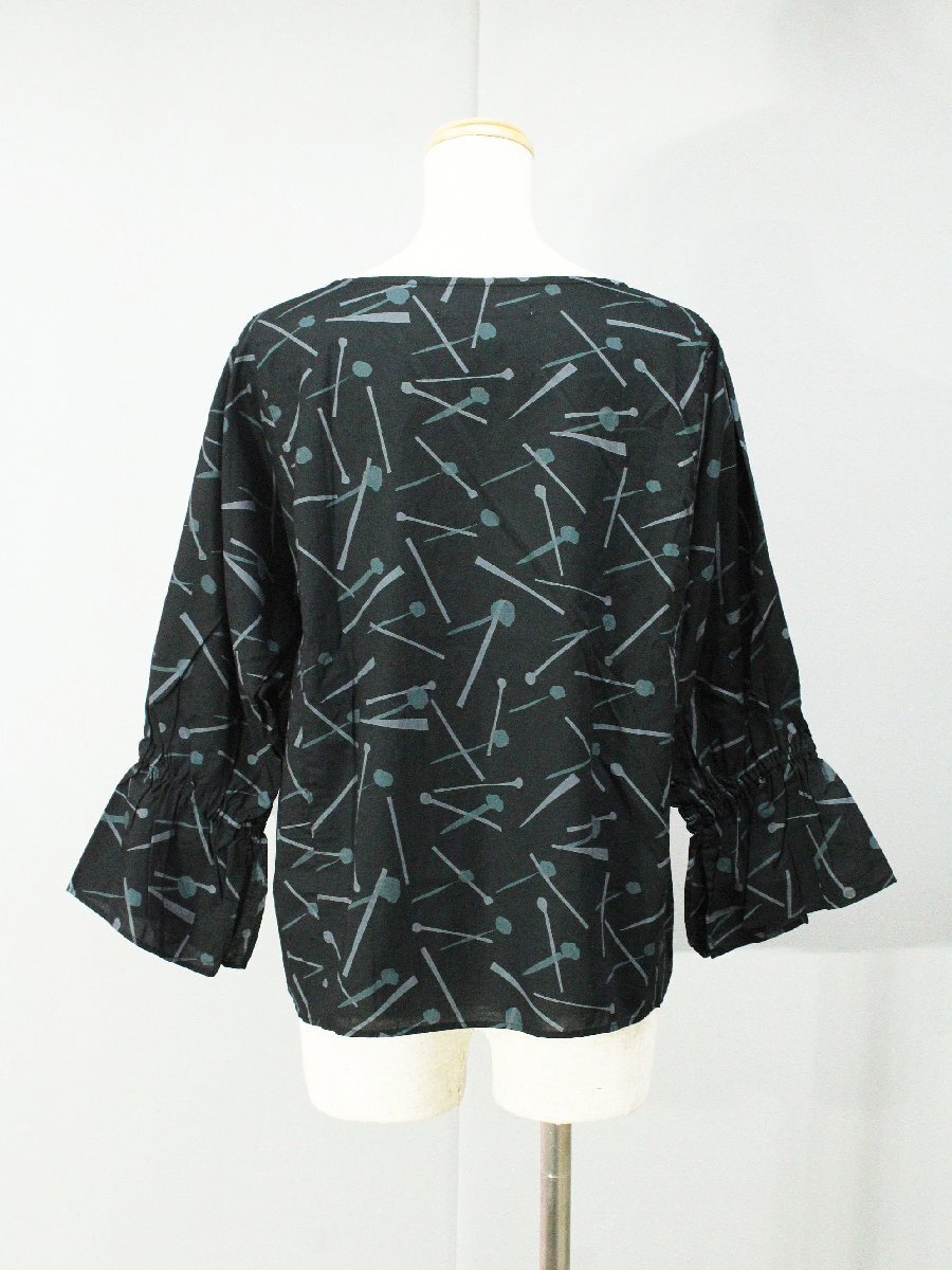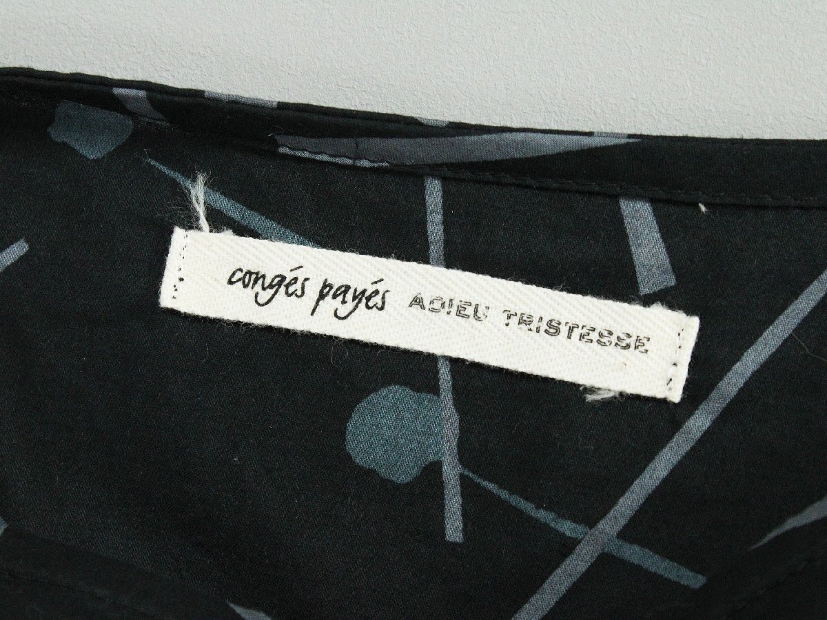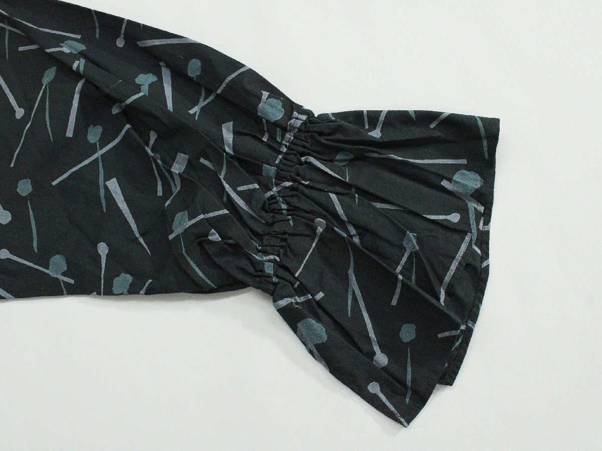 美品 conges payes/コンジェペイエ コットン100%総柄ベルスリーブブラウス 黒緑 rl758
