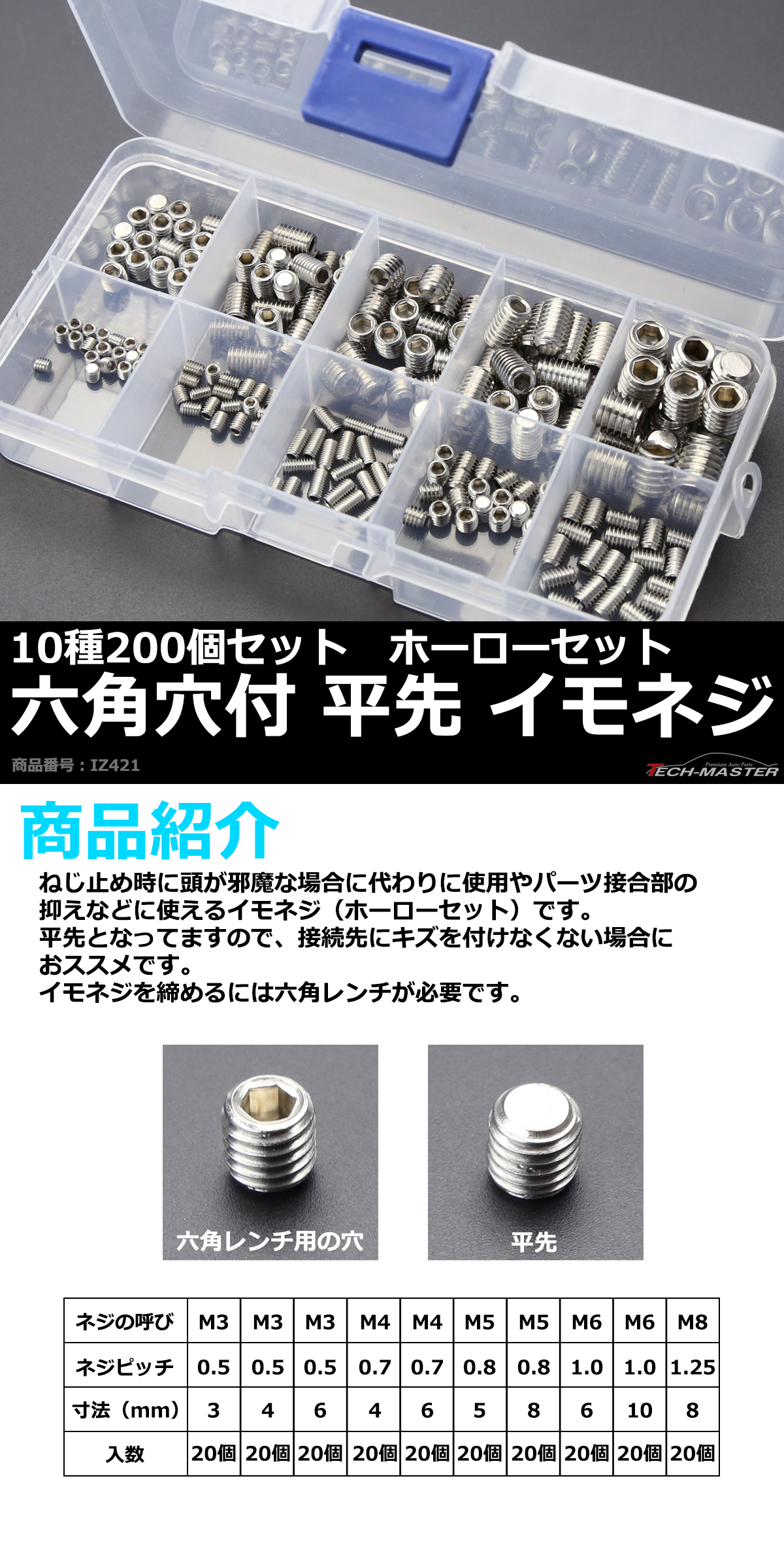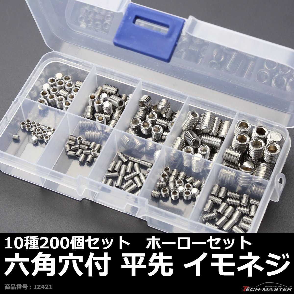 | 平先 六角穴付き イモネジ セット (ホーローセット) ケース付き 数量:1セット(10種 200個) M3、0.5ピッチ、寸法3mm × 20個 M3、0.5ピッチ、寸法4mm × 20個 M3、0.5ピッチ、寸法6mm × 20個 M4、0.7ピッチ、寸法4mm × 20個 M4、0.7ピッチ、寸法6mm × 20個 M5、0.8ピッチ、寸法5mm × 20個 M5、0.8ピッチ、寸法8mm × 20個 M6、1.0ピッチ、寸法6mm × 20個 M6、1.0ピッチ、寸法10mm × 20個 M8、1.25ピッチ、寸法8mm × 20個 サイズ:画像に記載 素材:鉄、亜鉛メッキ |