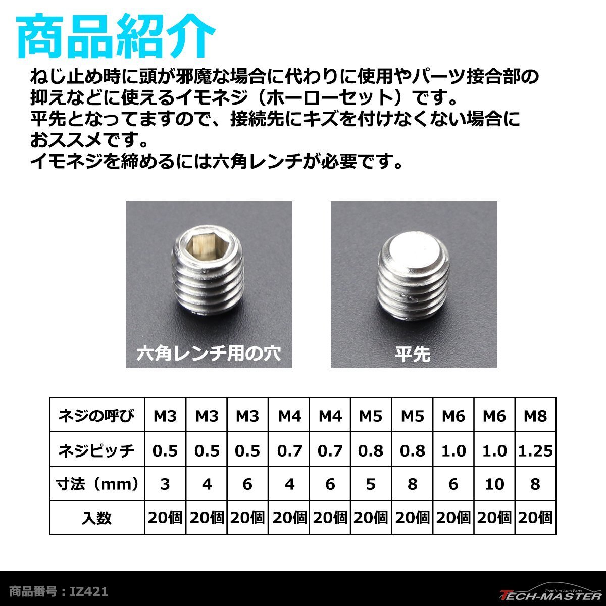 | ねじ止め時に頭が邪魔な場合の代わりに使用やパーツ接合部の抑えなどに使えるイモネジ(ホーローセット)です。平先なっておりますので、接続先にキズをつけたくない場合にオススメです。 イモネジを締めるには六角レンチが必要です。 |