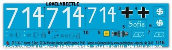 ペディングハウス社製 1/16戦車用ハイグレードデカール(スライド式転写マーク) 1/16 パンサー戦車用のデカールです。 1/15~1/16の戦車はラジコンモデルやディスプレイモデルで色々とリリースされています。ビッグモデルならではの迫力ある重厚感はもちろんのこと、数多くリリースされている金属パーツ類を取り付けてグレードアップしたり、大きなスケールを利用して細部に細かなディテールアップを施したり、楽しみ方は無限大です!しかし残念ながら師団マークやターレットナンバーなどのデカールはなかなか良い物がありません。特にHENGLONG(ヘンロン)、MATORROのRC戦車に付属しているデカールシールは非常にオモチャっぽく、せっかくリアルに仕上げた車両もそのシールを貼ることによってカッコ悪くなってしまいます。仮に良いデカールがあったとしても選択肢が非常に狭く自分の理想の車両に仕上げる事が出来ずガッカリされた方も数多くいらっしゃると思います。 こちらの商品はドイツのデカール専門店「ペディングハウス社」が製造した、ハイクオリティなデカールです。このデカールは過去に実在した車両のマーキングを1/16スケールでリアルに再現しています。 パンサー戦車(恐らくA型) 第5戦車連隊所属車両 SS機甲師団ヴァイキング ロシア 1943年 ★内容★ ターレットナンバー バルカンクロイツ(ドイツ軍の十字マーク) ソフィ(戦車のニックネーム) 師団マーク 戦術マーク 消火器ラベル 砲弾マーク2種 貼り付け図面 ■ご注意■ ●当デカールは貼り付け後の仕上がりを最重要視していますので、従来のデカールと比べ薄いです。貼り付けの際はゆっくりと慎重に作業して下さい。 ●それぞれのデカールはシート上で一体化しています。水に浸す前に必ず各デカールをホビーナイフ、カッター、ハサミなどで丁寧に切り取ってください。 ●デカールを貼り付ける部分に凹凸がある場合はクレオスのMrマークソフターをご使用下さい。(絶対にMrマークセッターは使用しないで下さい。) ●デカールに同封されている当社製作の貼り付け説明書(日本語)を良くお読みになり丁寧に貼り付けてください。 当商品は1/16用ですがサイズ的に1/15にも流用可能な物が数多くあります。 あなたの1/16戦車にこのハイグレードデカールを貼ってリアリティのある車両に仕上げてみてはいかがですか?! ご質問等ございましたらRC戦車担当のラブリーさん(ツボイ)までお気軽にお問い合わせくださいませ。 あなたのお気に入り戦車に、贈り物にいかがですか? 未使用、新品ですが、輸入時からのかすかな擦り傷、汚れ等があるかもしれません。 破損パーツ、不足パーツがないかを念入りに検品してから発送致します。万が一、商品に不良箇所があった場合は責任をもって良品と交換させていただきます。 |