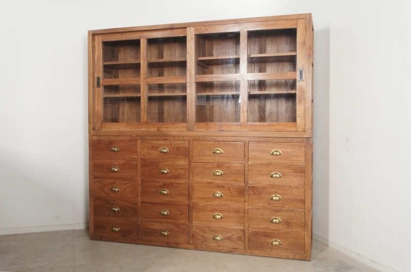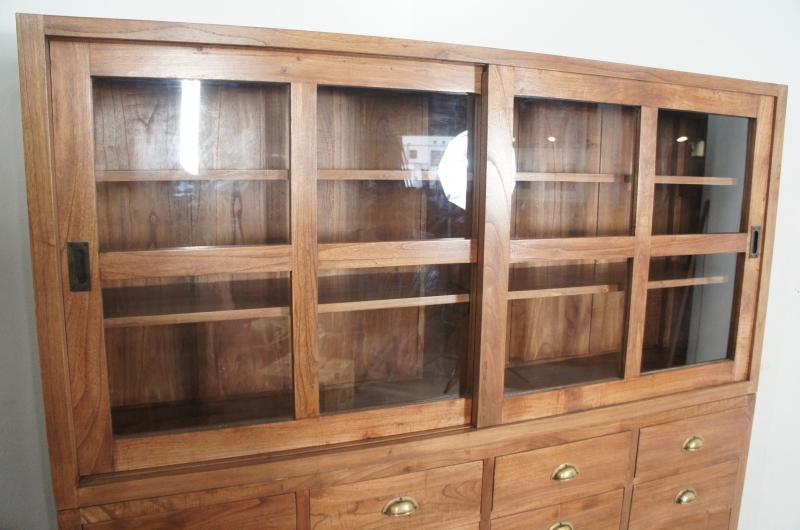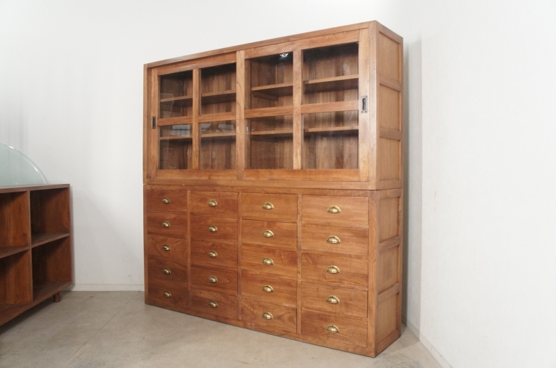 上段、下段に分かれ特大サイズで収納力があり上段のガラス引き戸を外して店舗什器としてお使いになっても重宝すると思います。