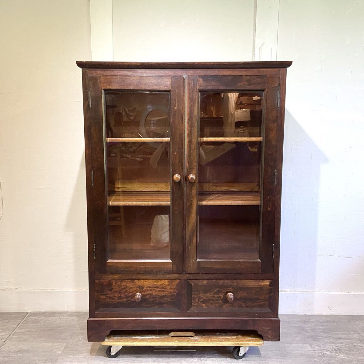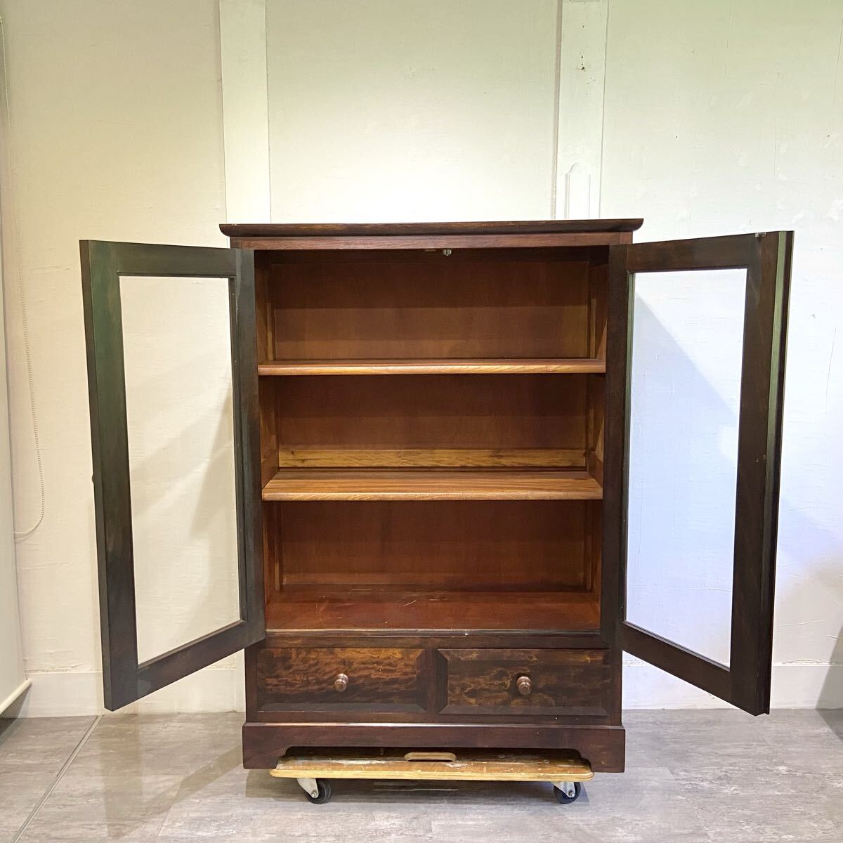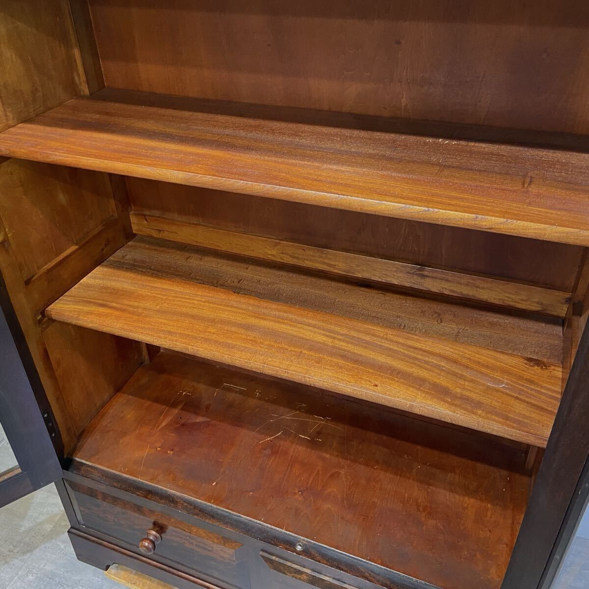 落ち着いたレトロな雰囲気が素敵な民芸調の本棚です。棚3段と引出し2杯、収納力は申し分ありません。ガラス扉付きで、ほこりをかぶる心配もありませんので、飾り棚や食器棚としても活用できます。レトロなインテリアがお好きな方におすすめです。
