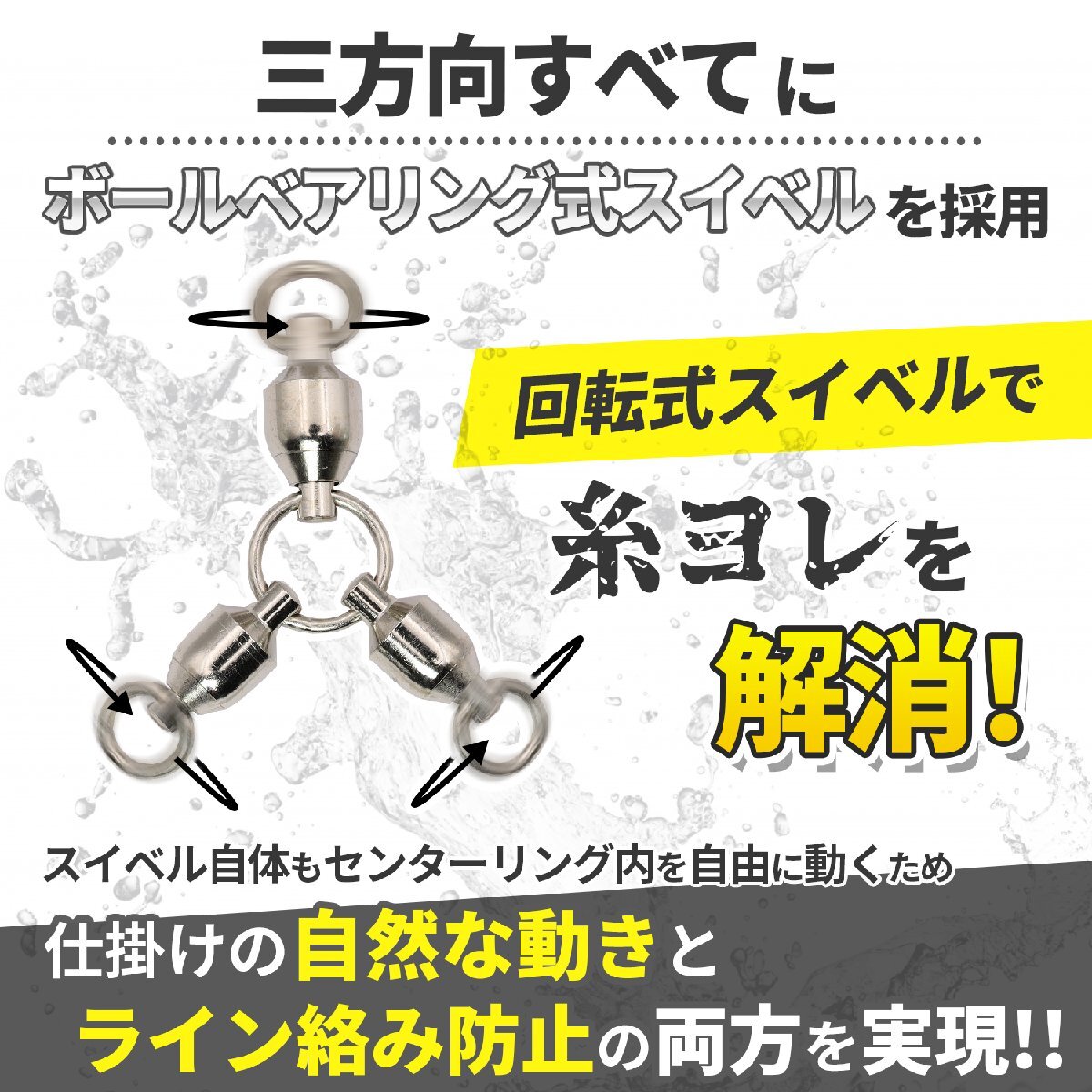 • 【ボールベアリング式スイベル採用】3方向すべてにボールベアリング式スイベルを採用し糸ヨレを解消!また、スイベル自体もセンターリング内を自由に動くので仕掛けの自然な動きとライン絡み防止両方を実現!