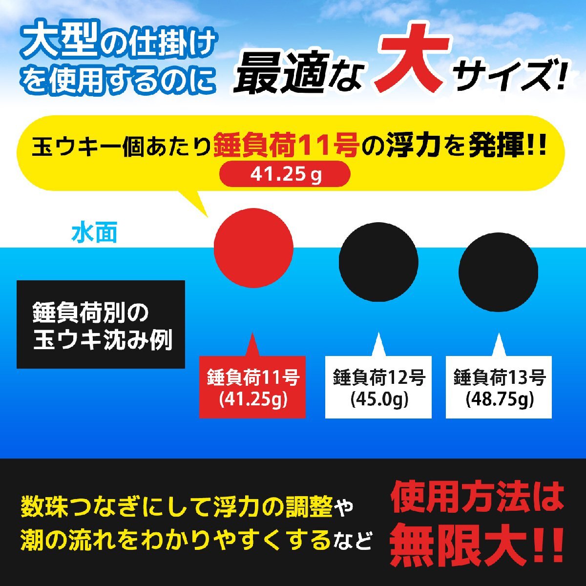 • 【錘負荷11号(41.25g)相当の浮力を発揮】玉ウキ1個で11号までの浮力を発揮します。複数個を数珠つなぎにすることで浮力+潮の流れを読むなど様々な使い方が可能。※12号の錘では水面より深く潜ってしまいます(検証済み)