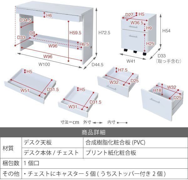 | 【カラー】 ダークブラウン、ナチュラル、ホワイト 【サイズ】 <外寸> デスク:幅100×奥行44.5×高さ72.5cm チェスト:幅41×奥行33×高さ54cm <内寸> デスク引き出し小:幅31×奥行31.5×高さ5cm デスク引き出し大:幅51×奥行31.5×高さ5cm 配線コードボックス:幅96×奥行8×深さ6.5cm チェスト天板:幅36.5×奥行27×高さ5cm チェスト引き出し小:幅32×奥行25×高さ7.5cm チェスト引き出し大:幅32×奥行25×高さ18cm 【材質】 デスク天板:合成樹脂化粧合板(PVC) デスク本体/チェスト:プリント紙化粧合板 【耐荷重】 デスク天板:(約)30kg以下 デスク引き出し:小(約)4kg以下 大(約)5kg以下 チェスト天板:(約)5kg以下 チェスト引き出し:小(約)5kg以下 大(約)7kg以下 【生産国】 インドネシア 【梱包】 サイズ:104×38×19cm、重量:31.5kg 【その他】 チェストにキャスター5個(うちストッパー付き2個) 【組み立て品】 お客様による組み立てが必要です。 |