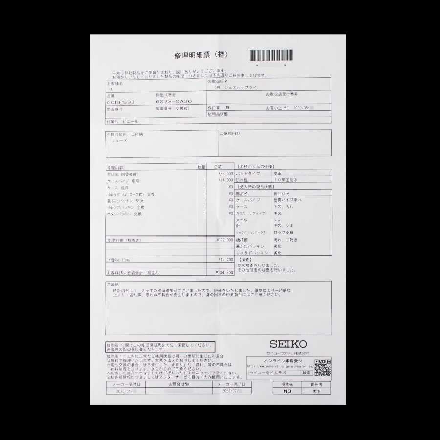 | 状態/備考 | ケース・ベゼル:小傷 ベルト:ヨレ 2025年7月分解清掃済 6ヵ月保証付。 ※保証の対象はムーブメントの自然故障のみとなります。 |