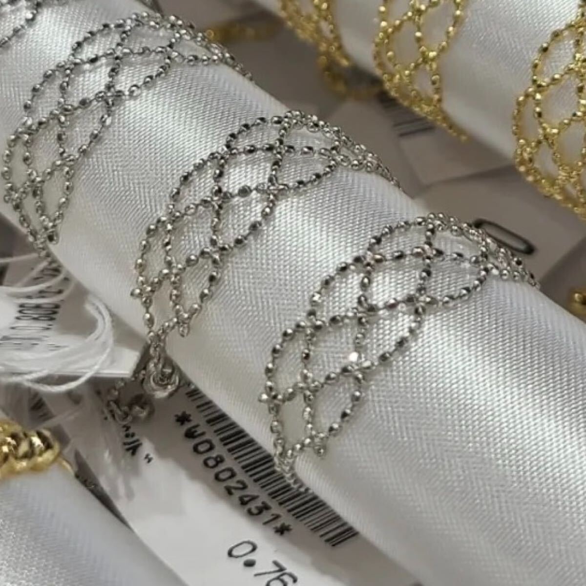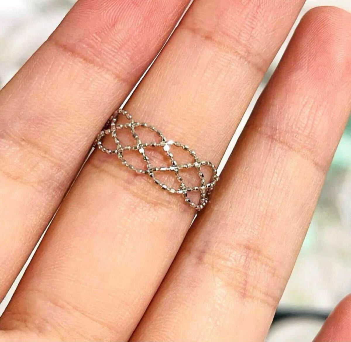 このリングは編み込みデザインが特徴です。どんなスタイルにも合わせやすく、普段使いから特別な日まで幅広く活躍します。