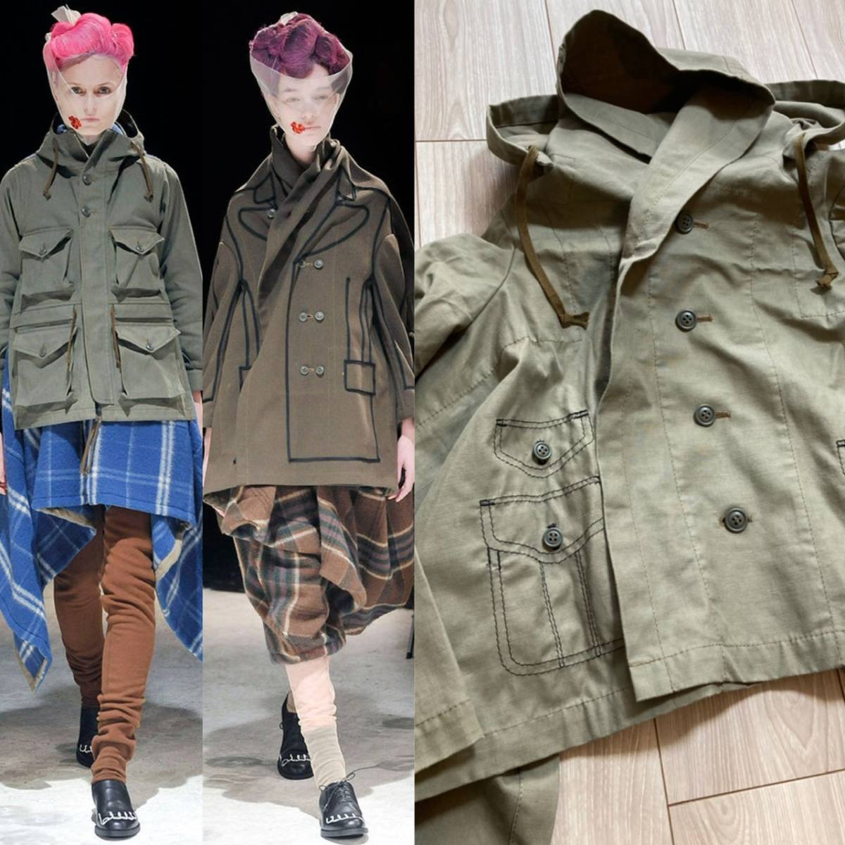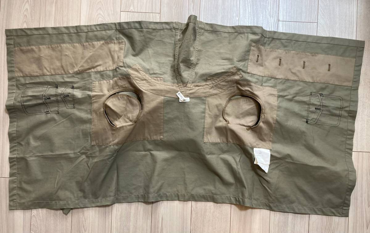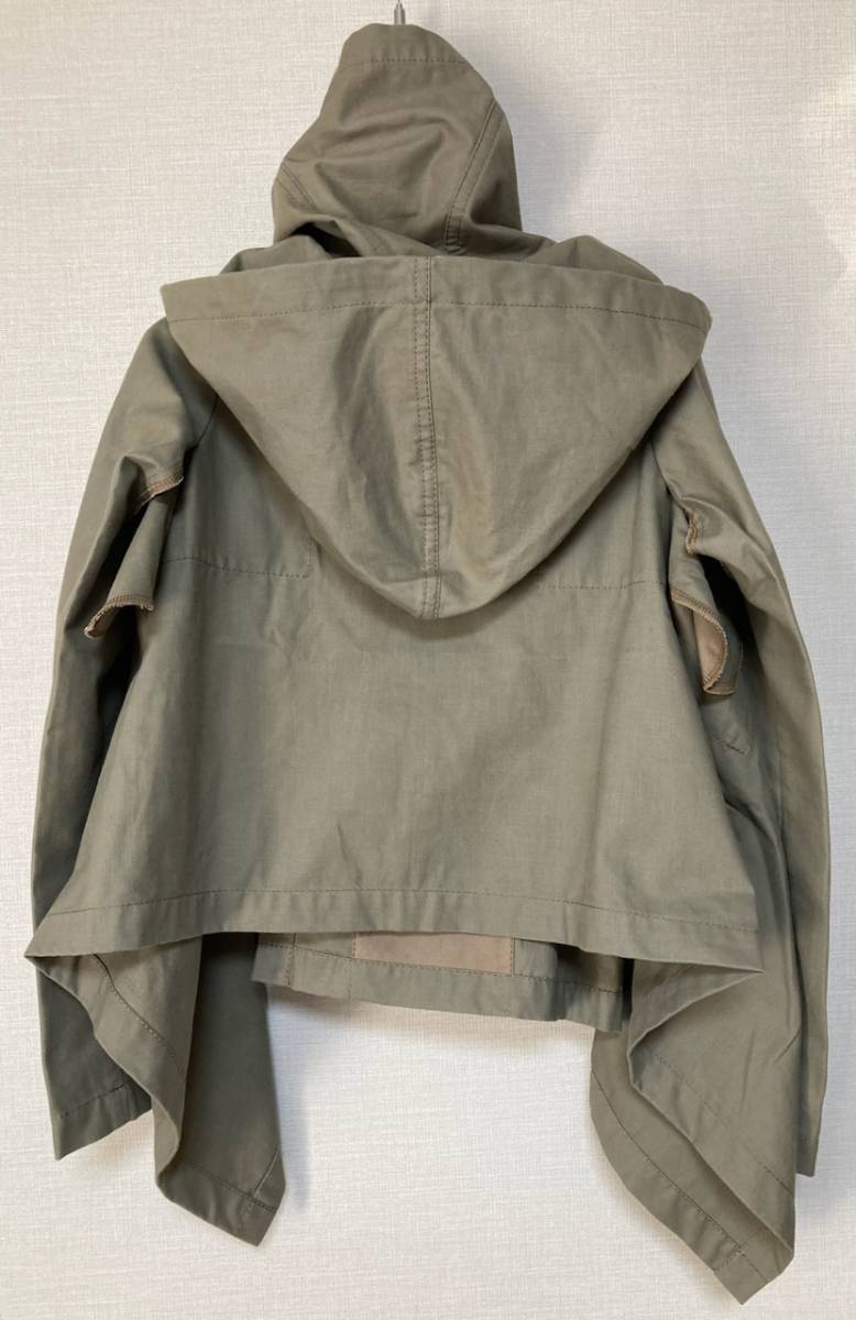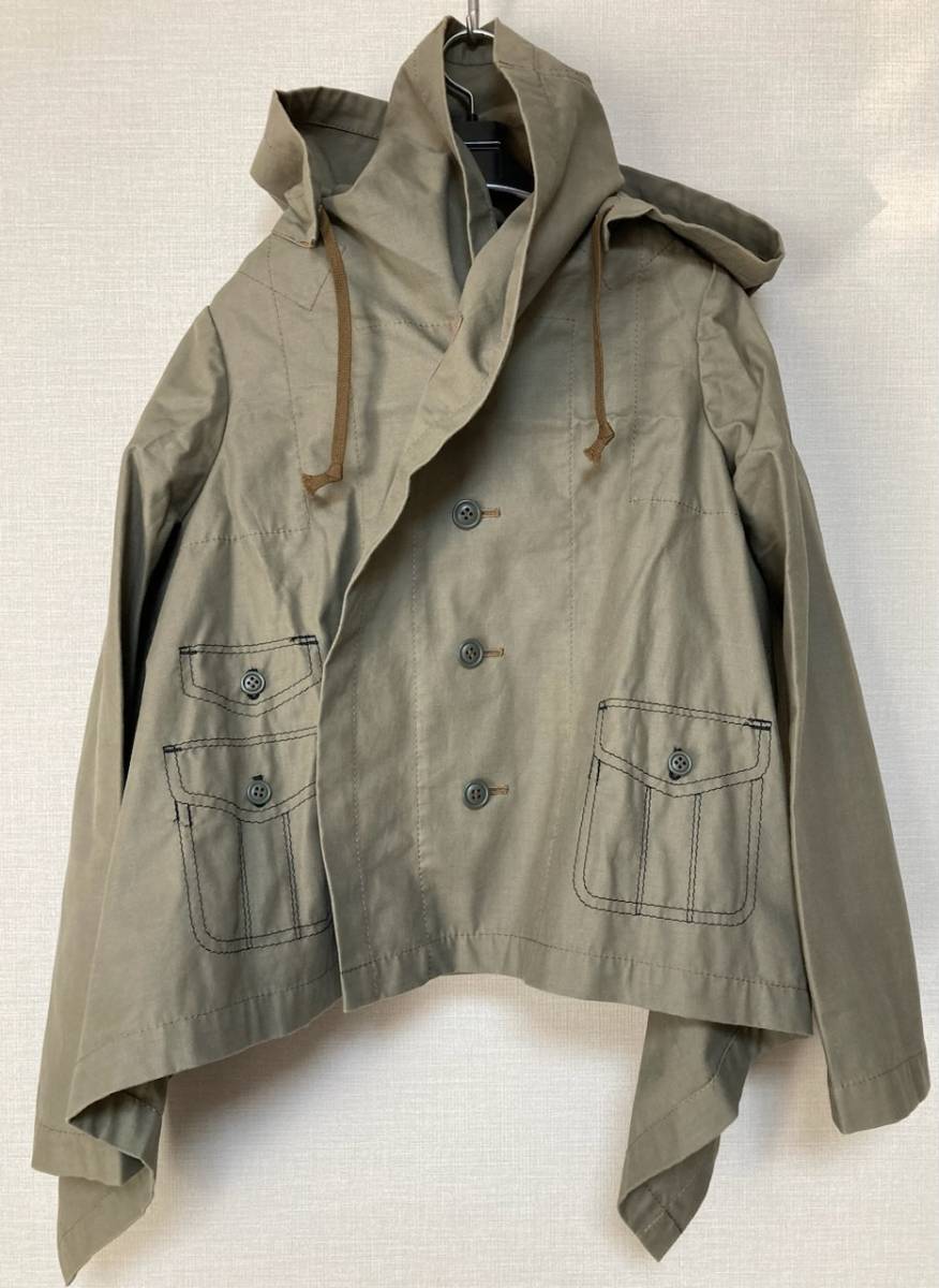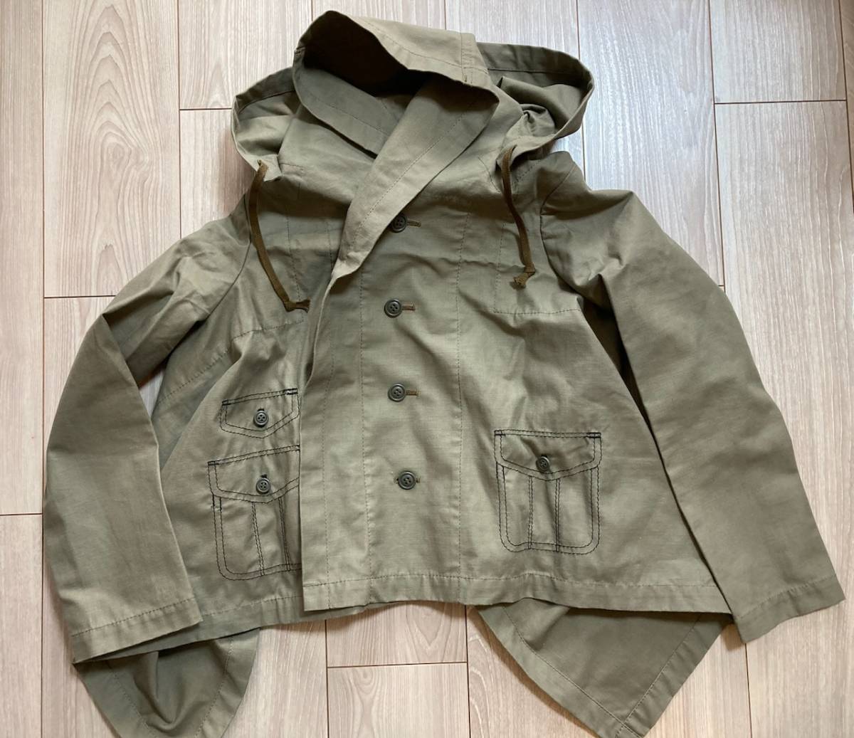 コムデギャルソン、綿素材フードジャケットです。ポケット柄のだまし絵刺繍が入っていて可愛く、薄手でサラッと羽織るのに使いやすいです。広げると長方形になり、着用するとサイドの布が斜めに下がって、ふわりと風をはらむようなニュアンスのあるシルエットになります。コレクションの物とは異なる形ですが、イメージのご参考に。長いシーズン活躍してくれるアイテムです。