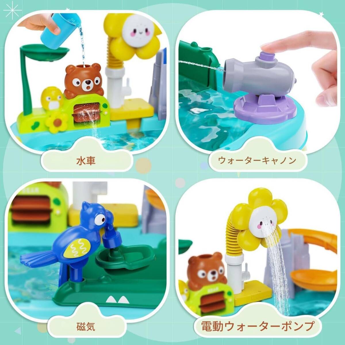多彩な遊びで感覚探求を刺激。水遊びテーブルでの没入型ごっこ遊びが創造力を育み、指先の運動能力向上に貢献する知育玩具です。