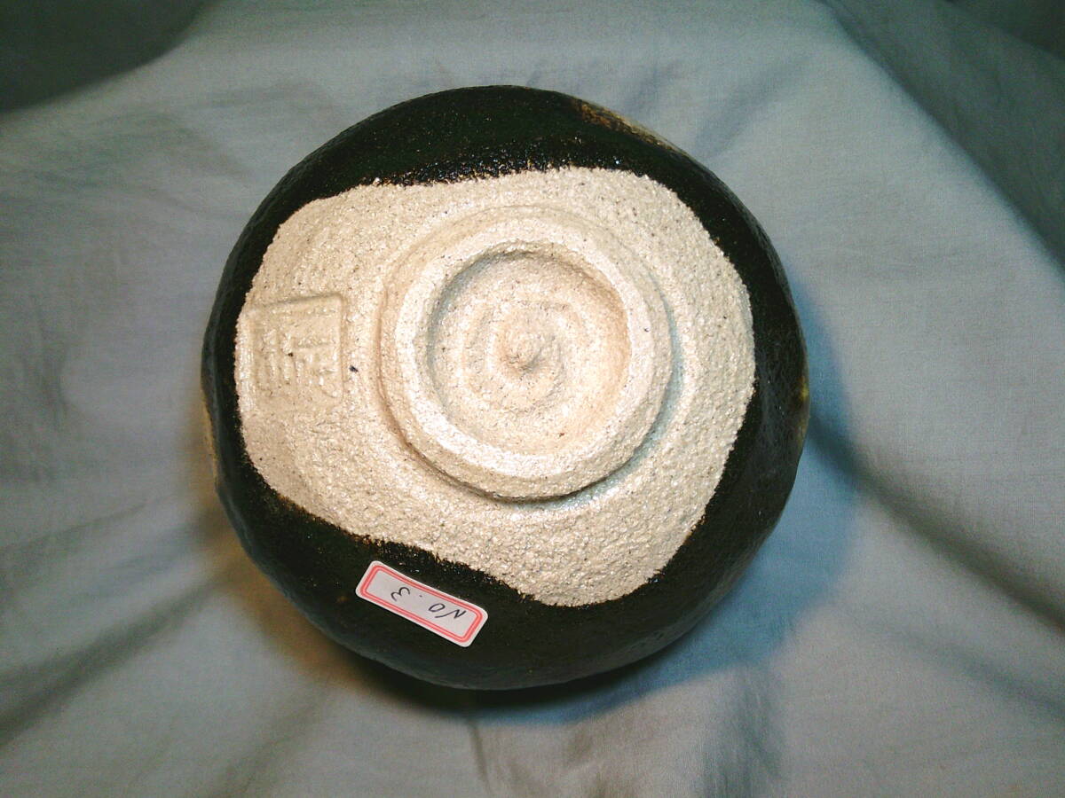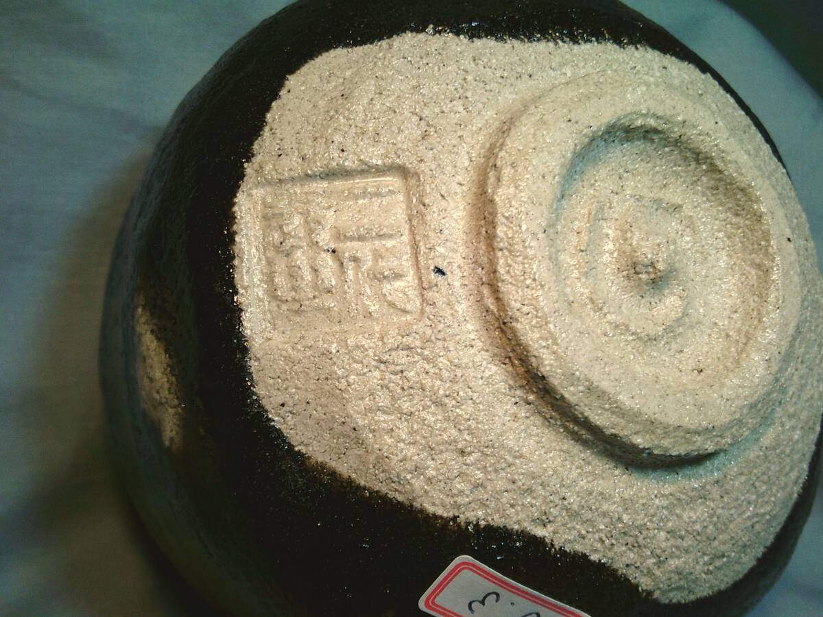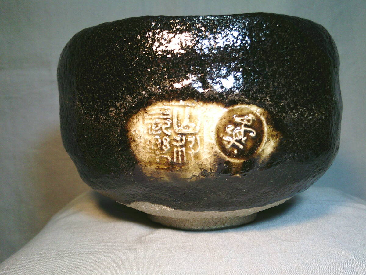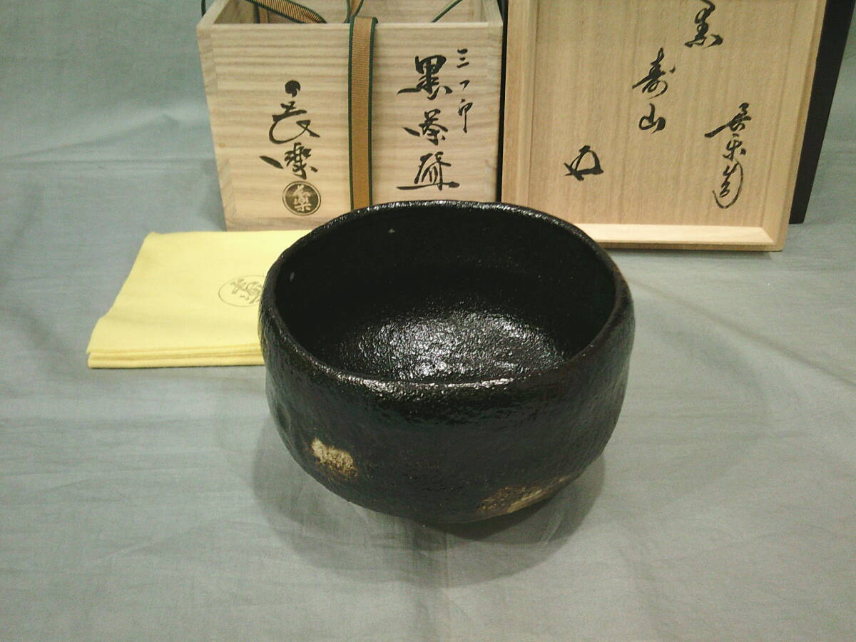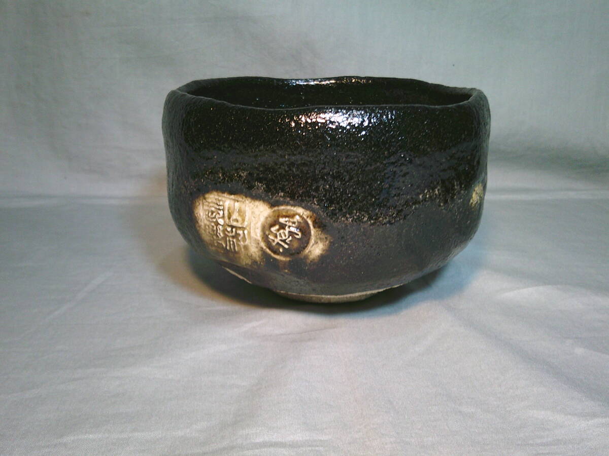 【商品説明】二代 小川長楽さん造の三ツ印 (丸印-長楽、山科長楽、二代長楽)の黒楽茶碗。裏千家-鵬雲斎の書付があります。銘-寿山。