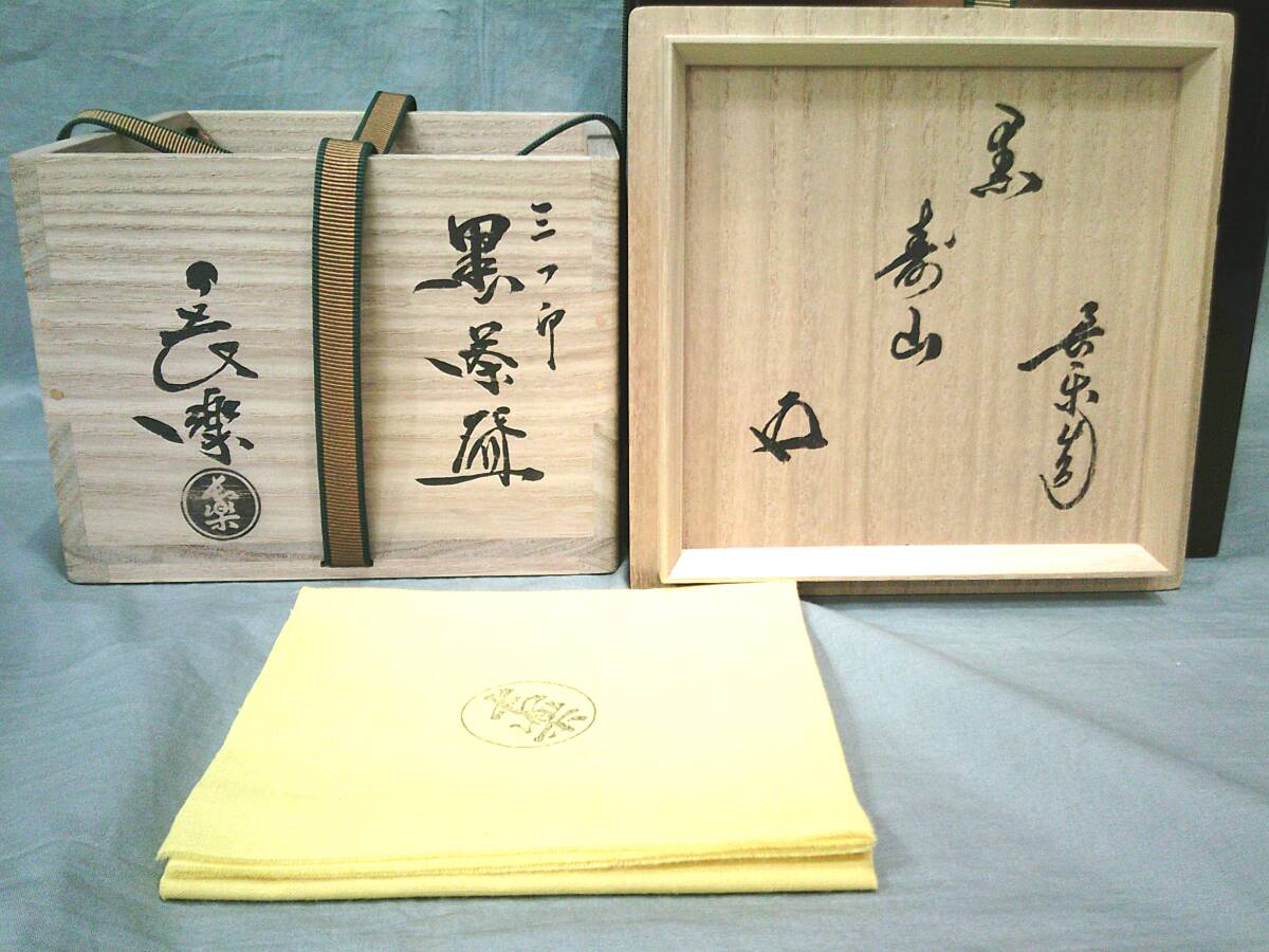 △「二代 小川長楽 三ツ印 黒楽茶碗 裏千家-鵬雲斎 書付 銘-寿山」共箱(書付箱)二重箱 共布△茶道具 抹茶碗