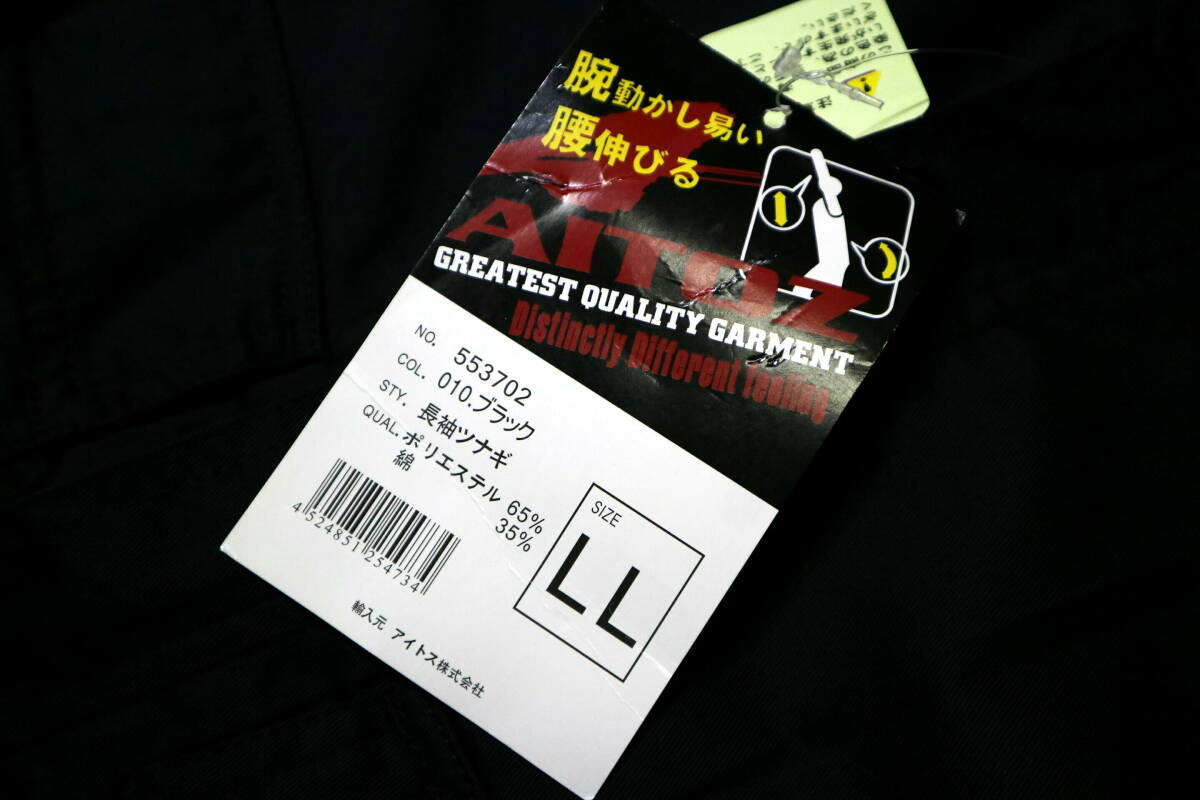 ・AITOZのつなぎ、アイトス株式会社の輸入販売、日本企画の中国製です。
