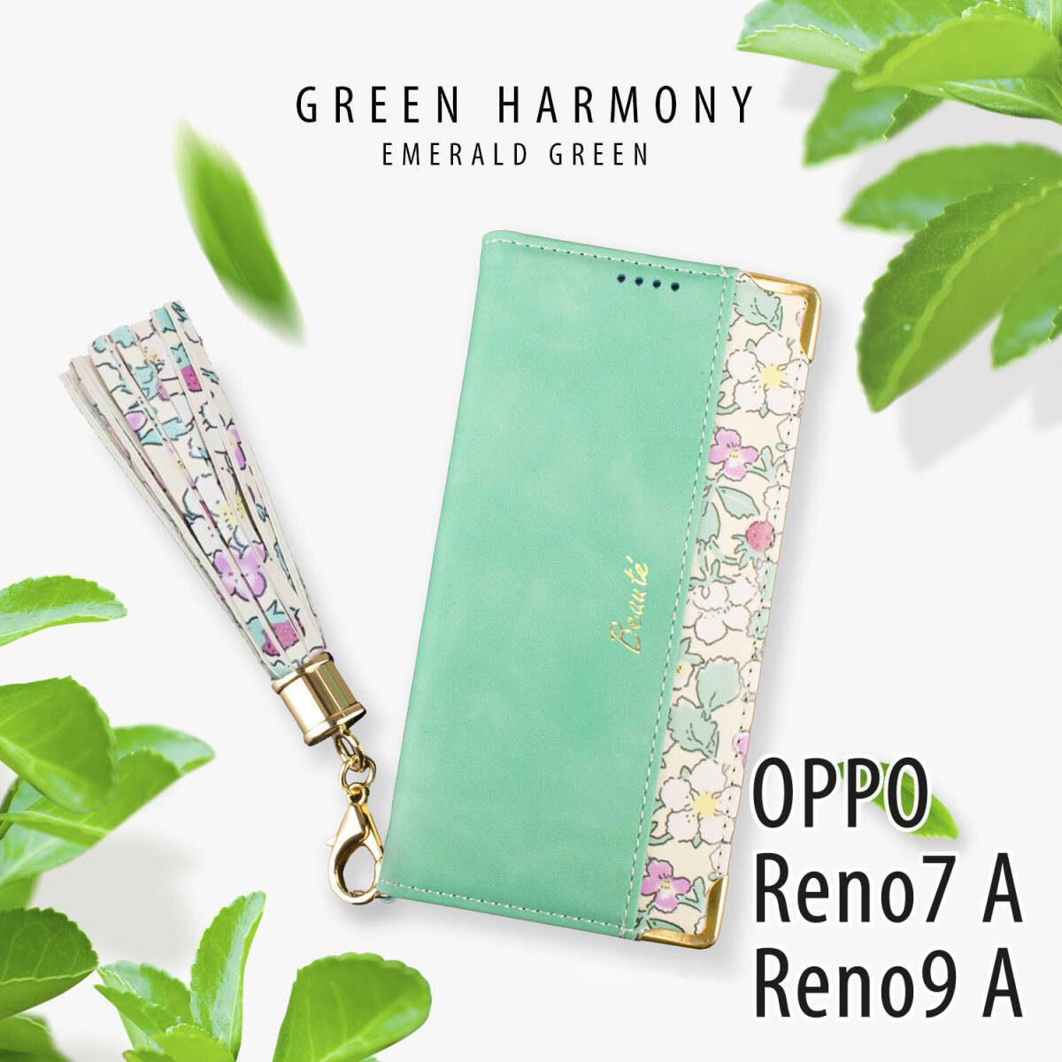 OPPO Reno9A Reno7A ケース 手帳型 かわいい 緑 CPH2523 A301OP カバー 花柄 グリーン ストラップ ミラー おしゃれ 安い スマホケース 人気