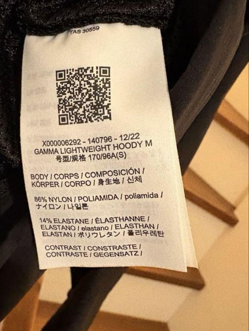 2023年に大阪梅田のグランフロント大阪で購入した、ガンマライトウェイトフーディ、サイズSです。店舗購入なので間違いなく正規品です。着用は5回程度で、新品同様の美品です。アウターが増えすぎたため断捨離で出品します。