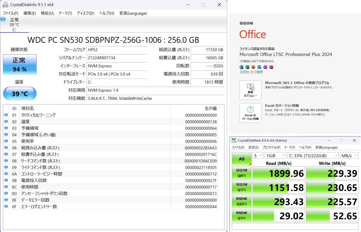 ・ストレージ:M.2NVMe SSD  WDC PC SN530 SDBPNPZ-256G-1006:256.0GB ※画像参照