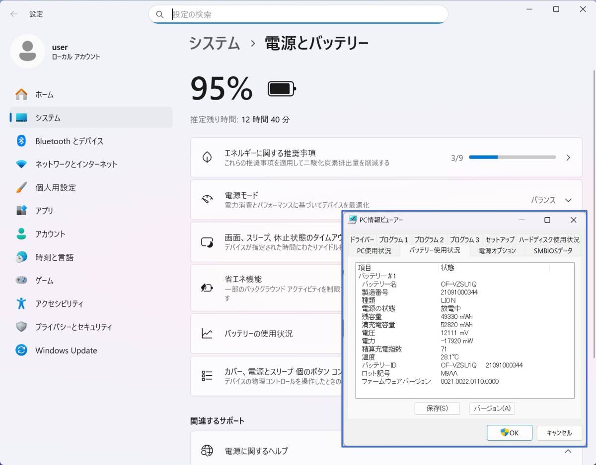 ・バッテリー:Windows 推定残り時間:12時間40分(95%)  ※この時間を保証することではありません