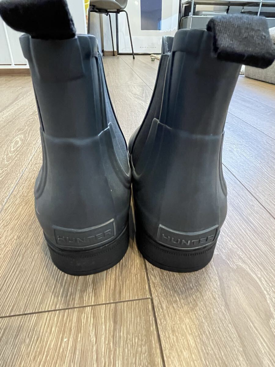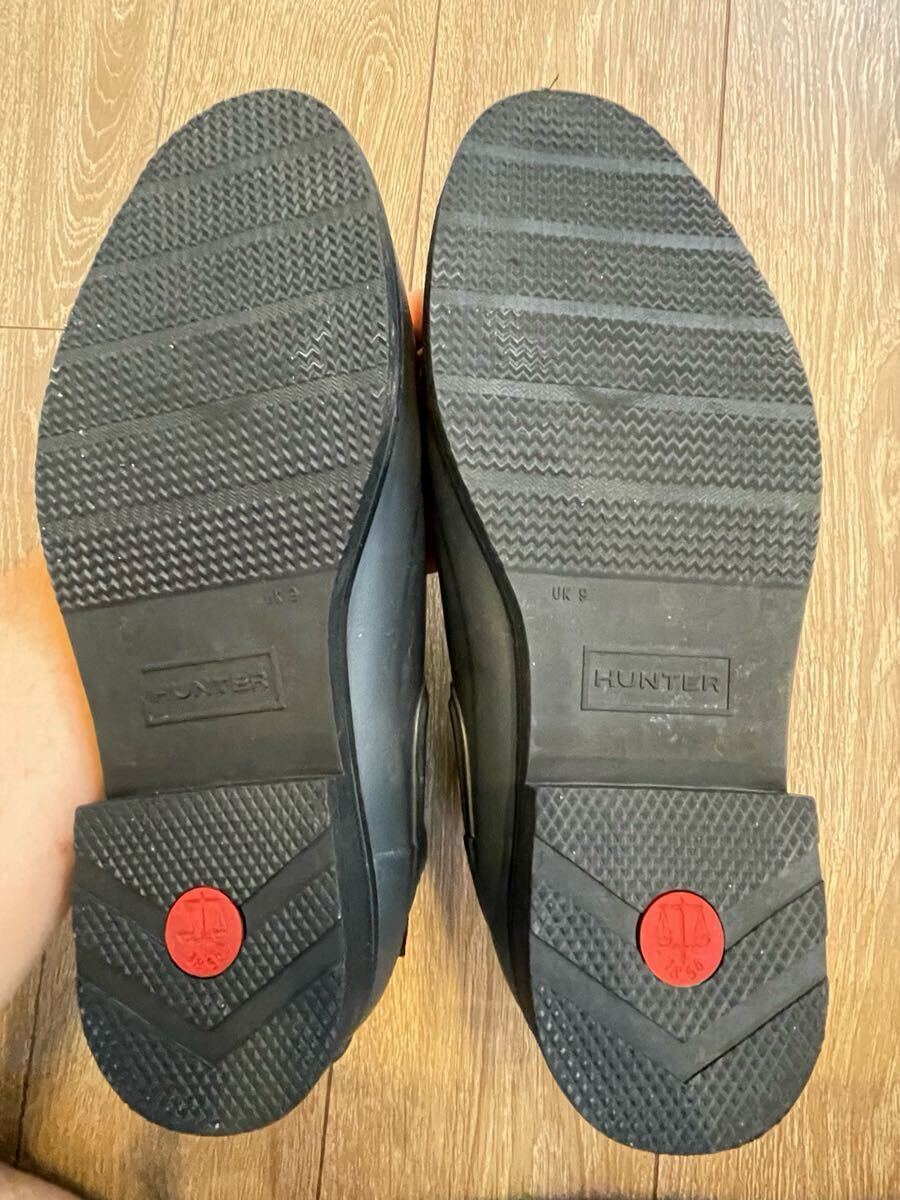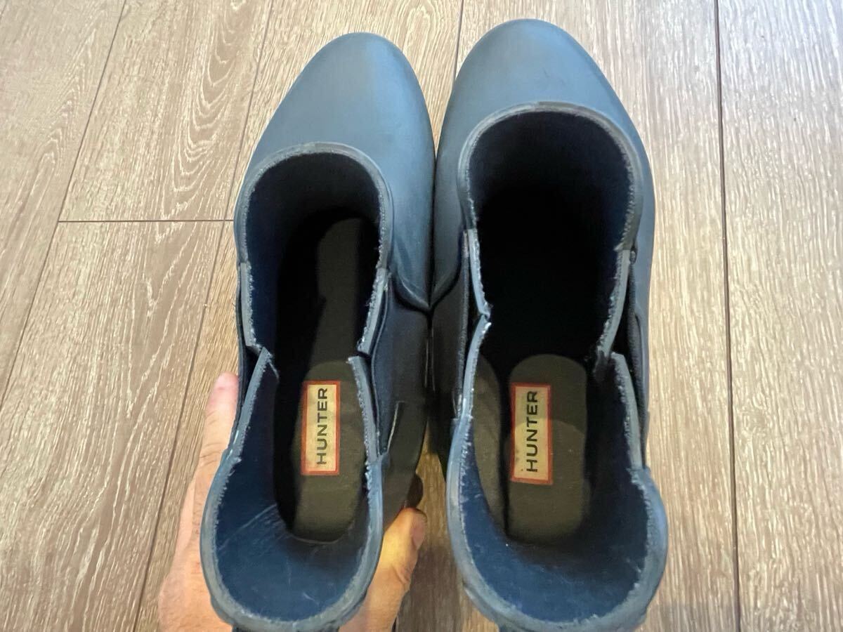 新品で購入後、2〜3回使用しました。その際の汚れが少しあるかもしれませんが状態はとても良いと思います。ハンターのロゴもかかと部分にありますが、あまり目立たず落ち着いた印象です。また雨の日に気軽に履けるのでとても重宝します。
