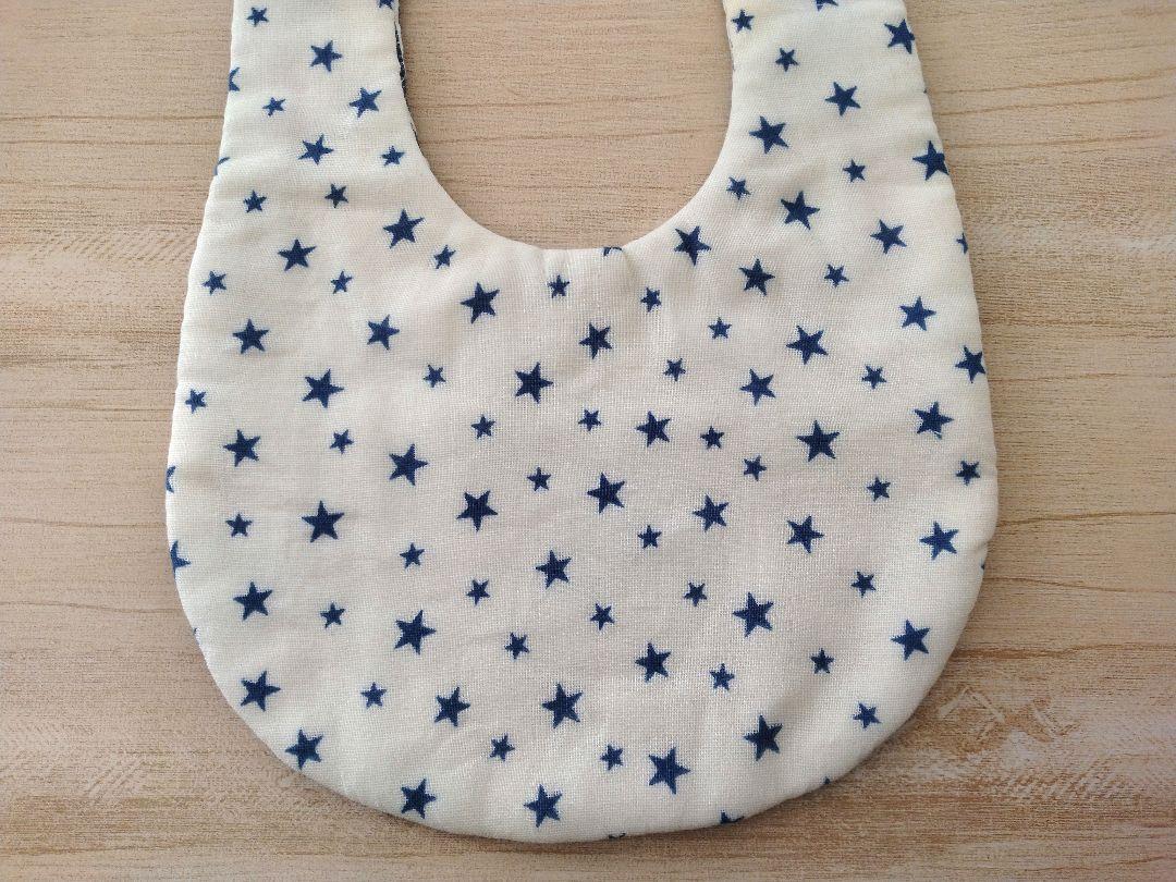 こちらのスタイはプラスチックのスナップボタンを使用しており、お子様の首の太さに応じて二段階に調節できるようになっています。