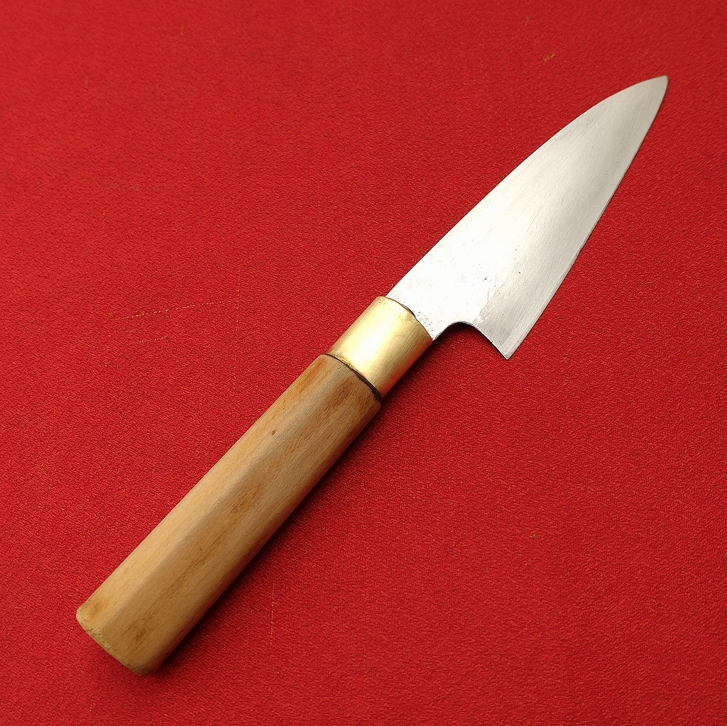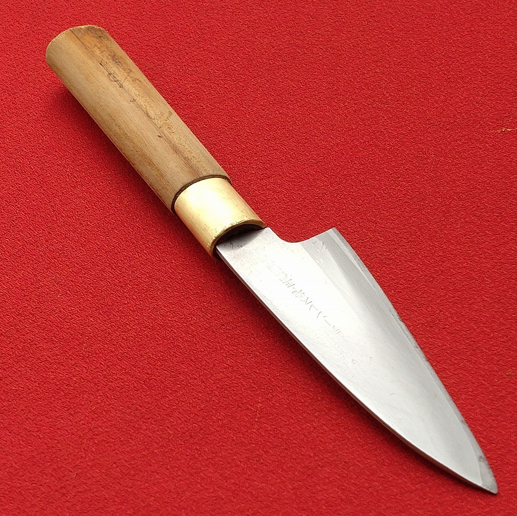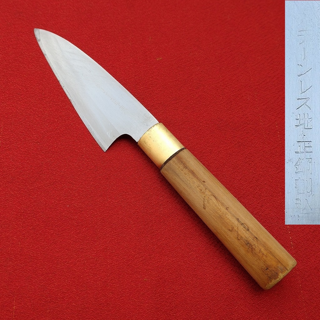 小出刃包丁 鯵切 三寿々 ステーンレス地・正鋼割込 刃長約93㎜ 峰厚約1.5㎜ 両刃 小型出刃 真鍮桂 調理器具 刃物 日本製 【4498】