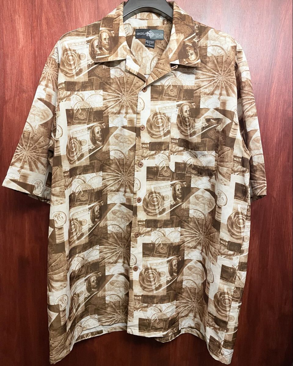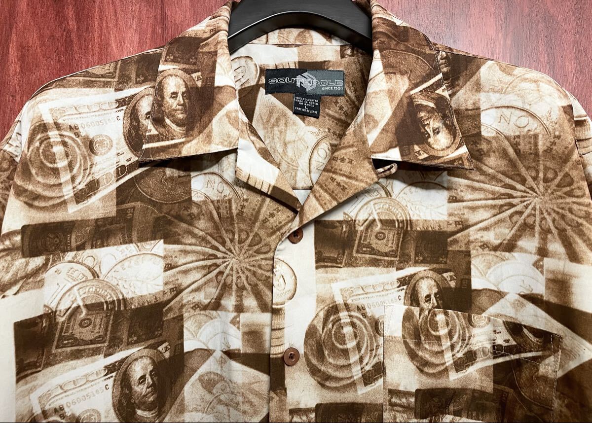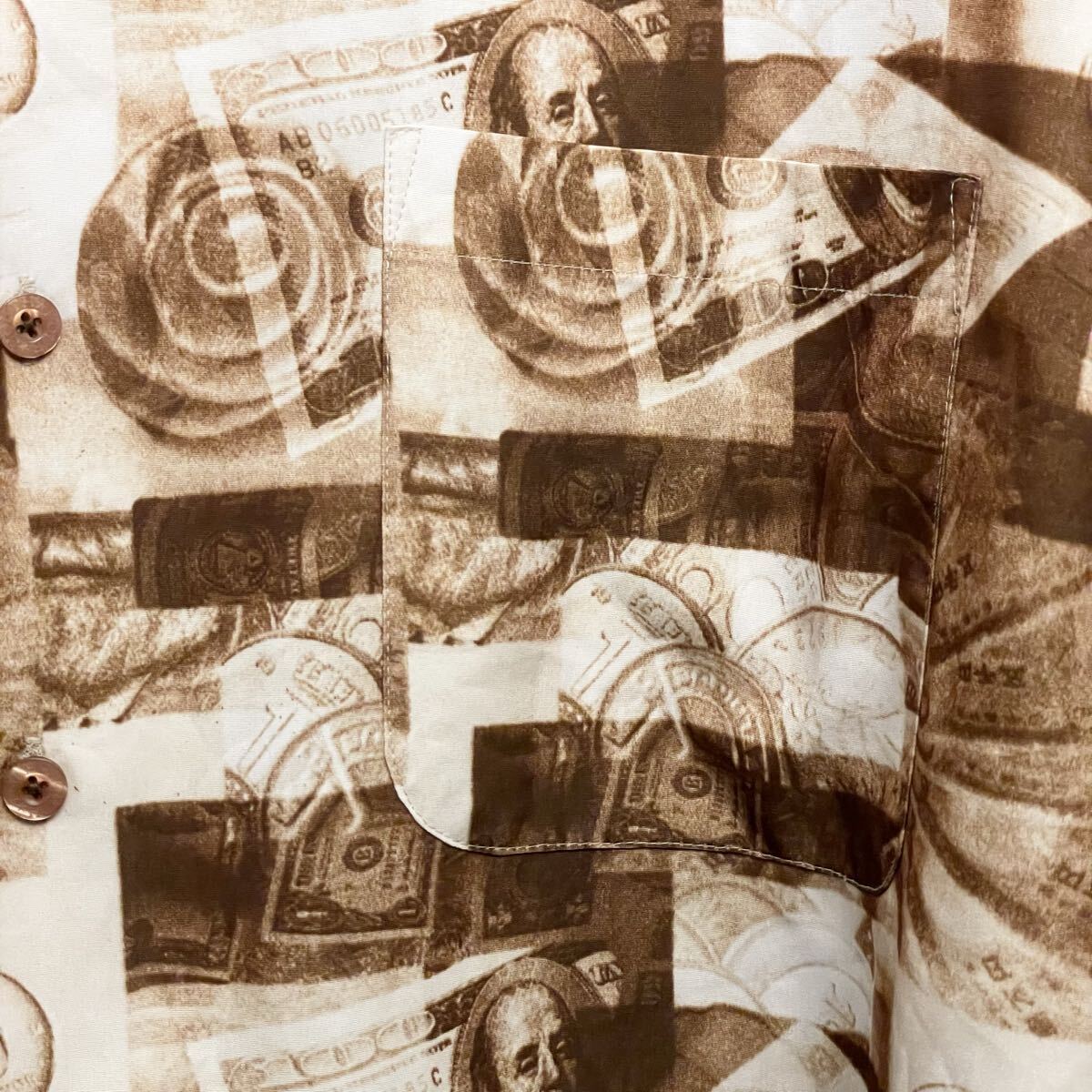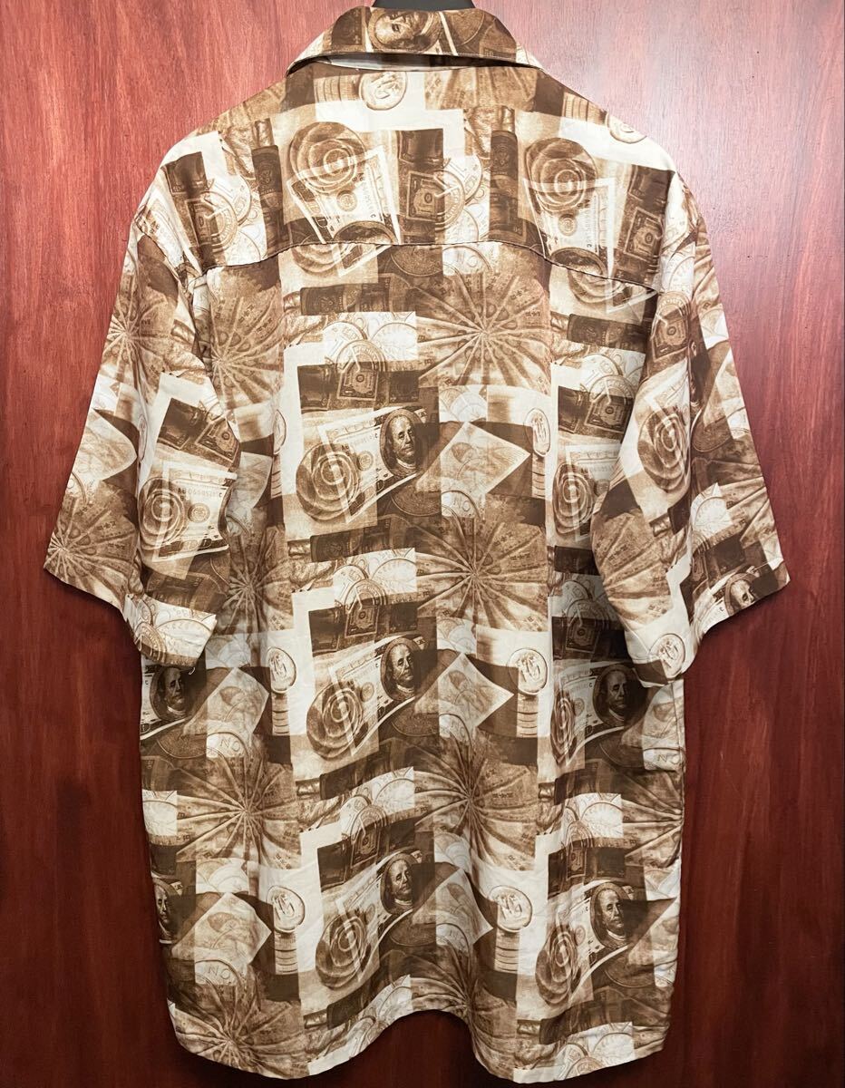 ベンジャミンと呼ばれるアメリカの100ドル札や日本円などお金をモチーフにしたオリジナルデザインが全面に入ったB-BOYブランドらしいアロハシャツブランドでは見かけないようなデザインになっており、ポリエステル素材なのでシワになりにくくノンアイロンで着られる管理も非常にしやすいです。