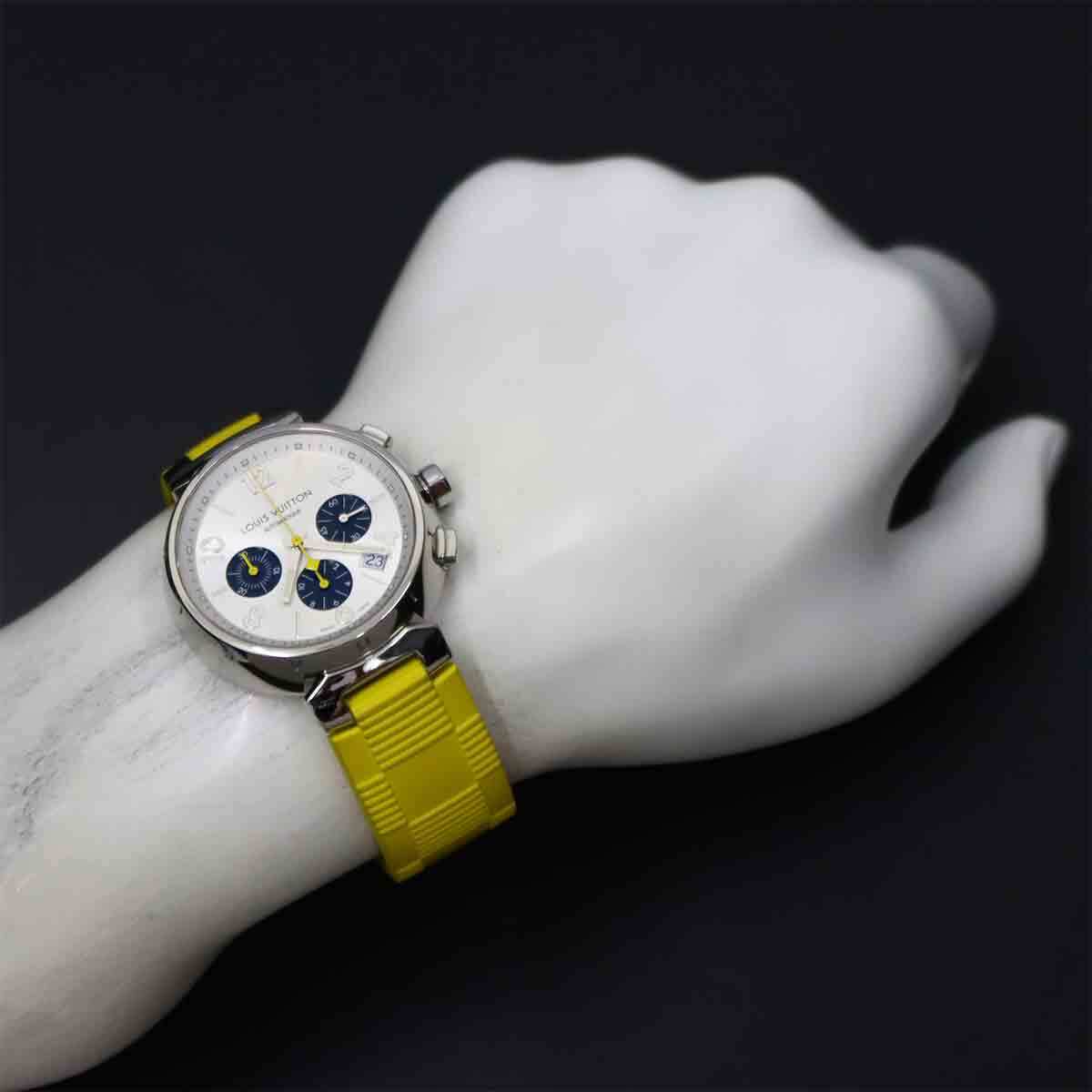 商品概要 | ヴィトンからシンプルなデザインが人気の『タンブール クロノグラフ』です。ブラウンカラーのイメージの強いヴィトンでは珍しいシルバー文字盤にブラックのスモールセコンドは存在感抜群で腕元をお洒落にするお勧めの逸品です。 |