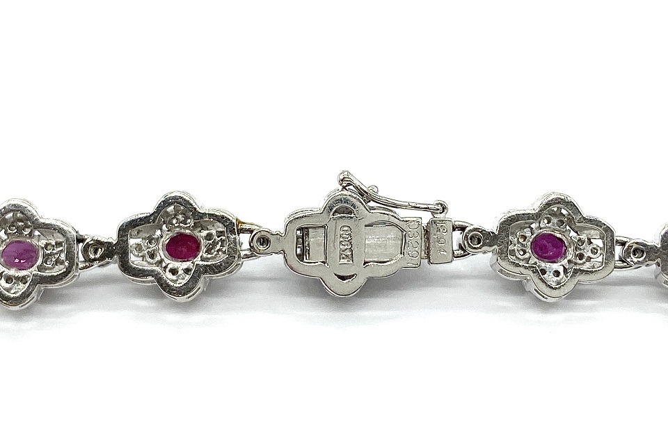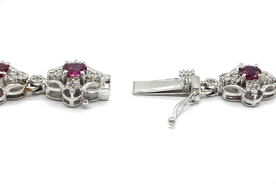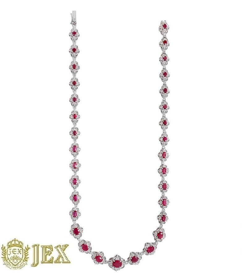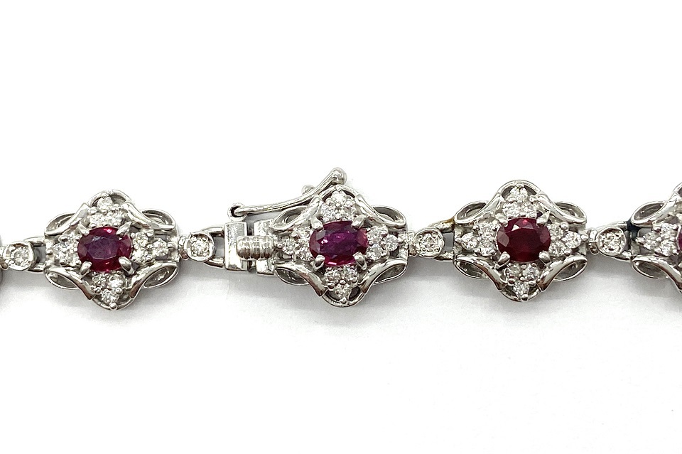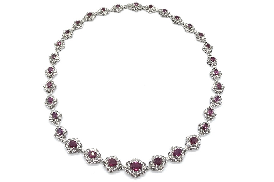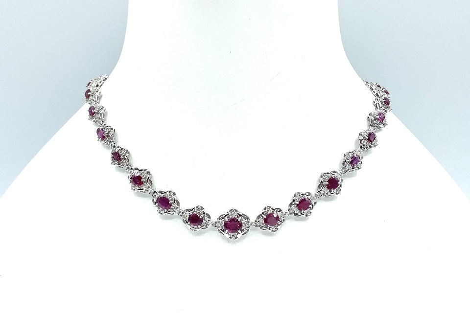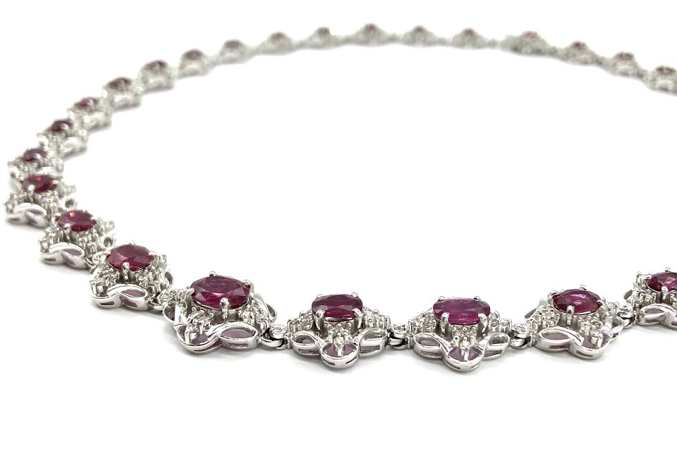 解説 | ルビーレッドの色をあわせつつ、大小のグラデーションで一周連ねるのは容易ではありません。特別なシーンでも、情熱を秘めたエレガントな輝きが人目を惹くでしょう。モチーフ一つ一つがリングだったらと考えると・・・奇跡の価格。 |