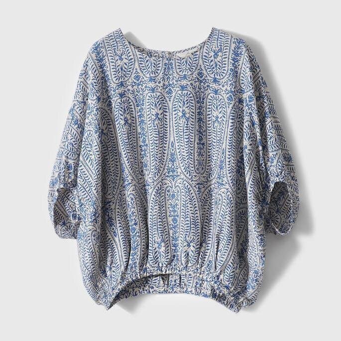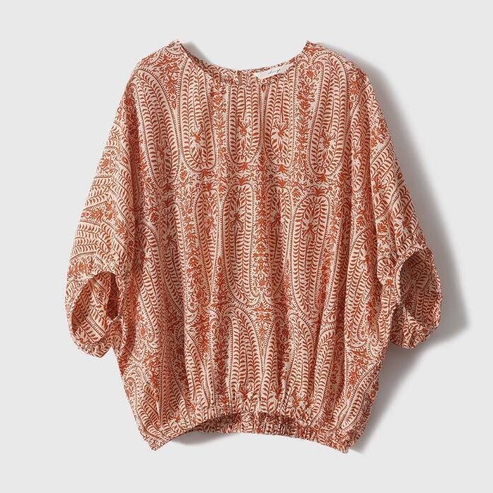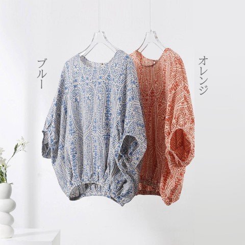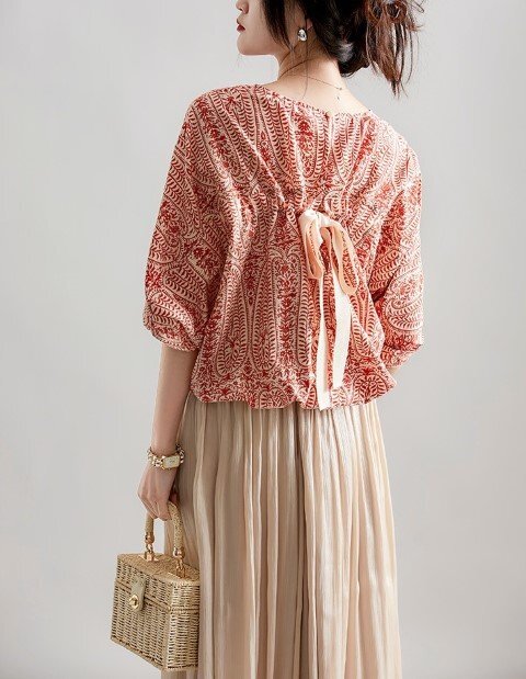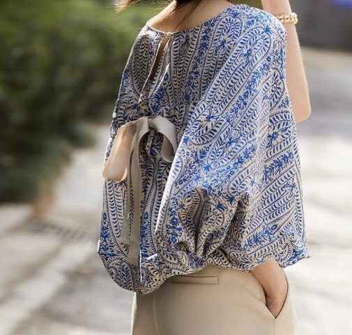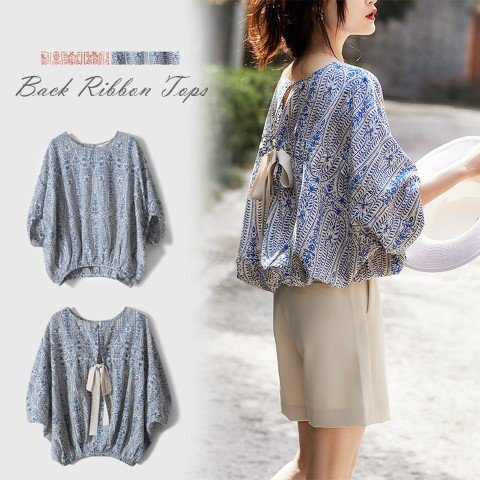 ・エスニック風の模様がプリントされたデザインで目を惹くアイテムです。バックリボンがフェミニンな雰囲気をプラスしてくれます。