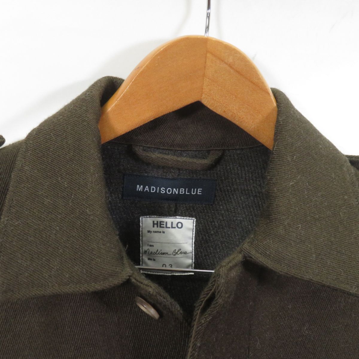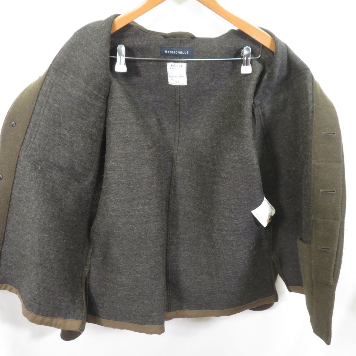 【ブランド】 MADISON BLUE/マディソンブルー 【サイズ】 3 実寸[着丈68cm 肩幅48cm 身幅55cm 袖丈63cm ] 【商品状態】 目立った汚れやダメージはありません。 ★Bランク★ S:新品、未使用品 A:使用感は少なく、程度良好 B:使用感はあるが汚れやダメージは気にならない程度 C:使用感があり、多少の汚れやダメージがある D:使用感があり、汚れやダメージが目立つ E:汚れやダメージが目立つジャンク品 【商品詳細】 (株)MADISON BLUE 品番MB194-1014 日本製