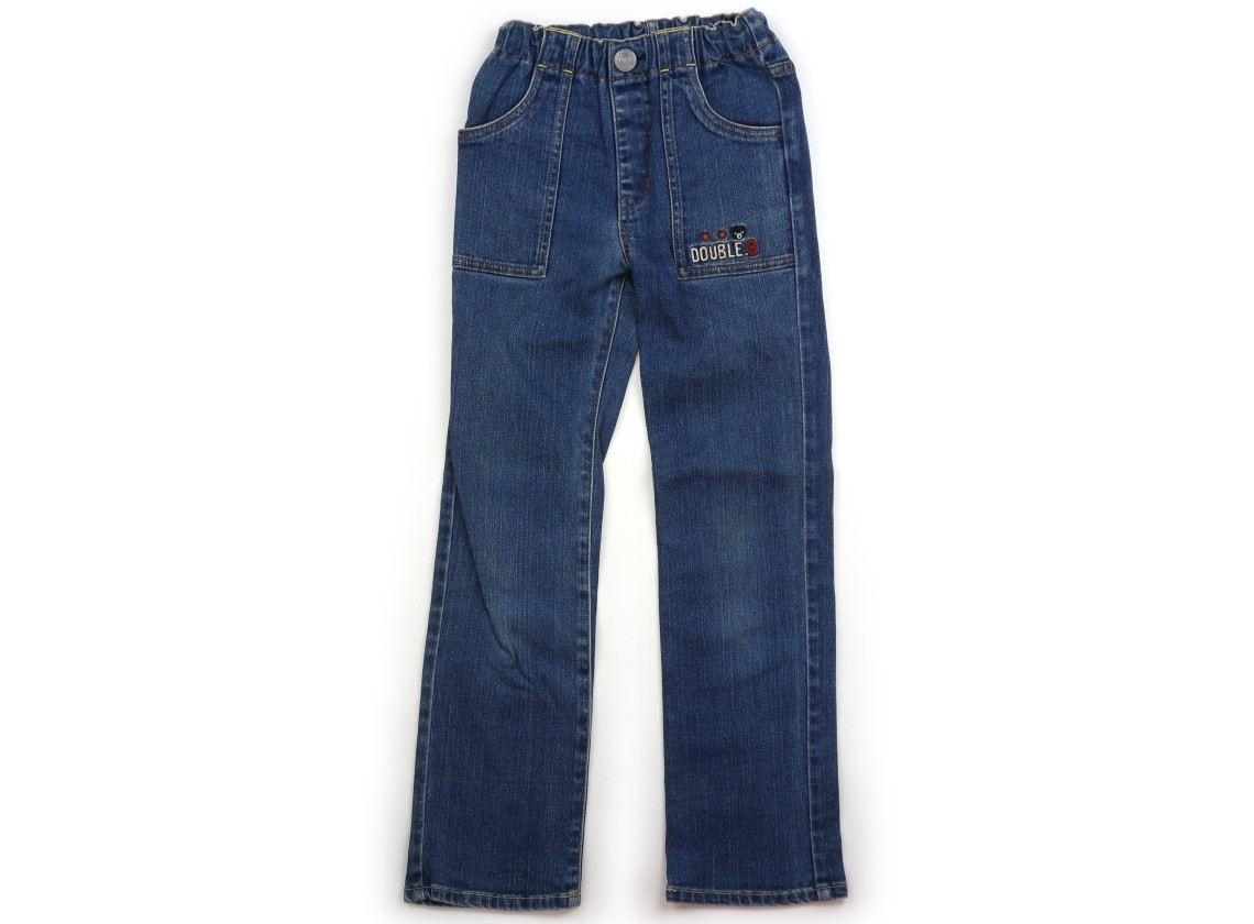 サイズ調整ゴムが付いています。デニム地特有のユーズド感あり。膝まわり、薄黄色の汚れ跡が見受けられます。使用感はありますが、まだお使いいただけそうです。