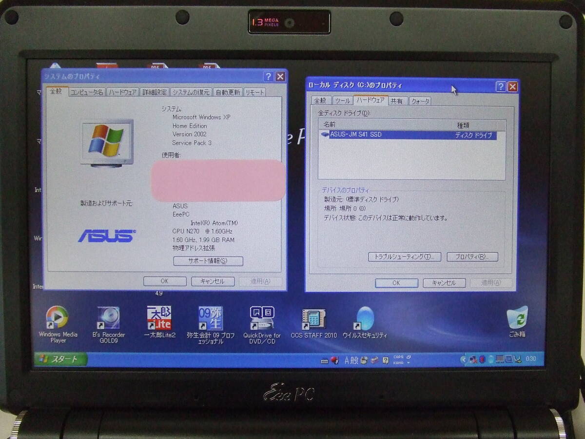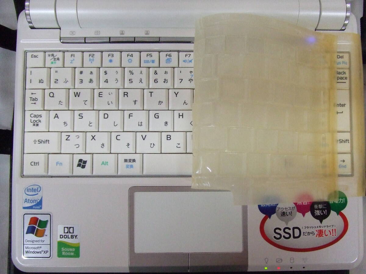 Windos XP Home Edition(SP3)起動、Atom N270 1.60GHz、メモリ2.0GB、ASUS-JM S41 SSD(16GB)、専用キーボードカバー(FA-NEPC)、汎用レザーケース付
