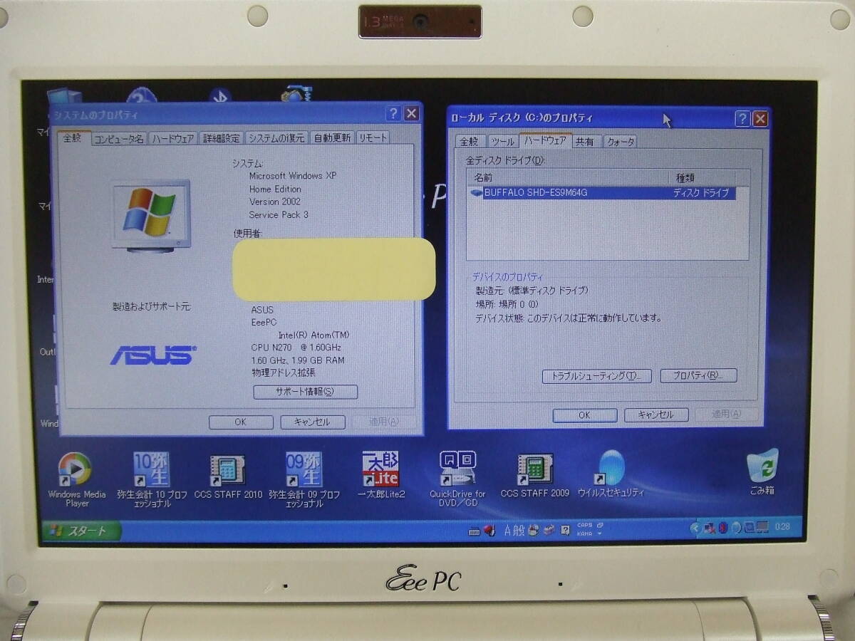 Windos XP Home Edition(SP3)起動、Atom N270 1.60GHz、メモリ2.0GB、BUFFALO SHD-ES9M64G(64GB)、専用キーボードカバー(FA-NEPC)、汎用レザーケース付