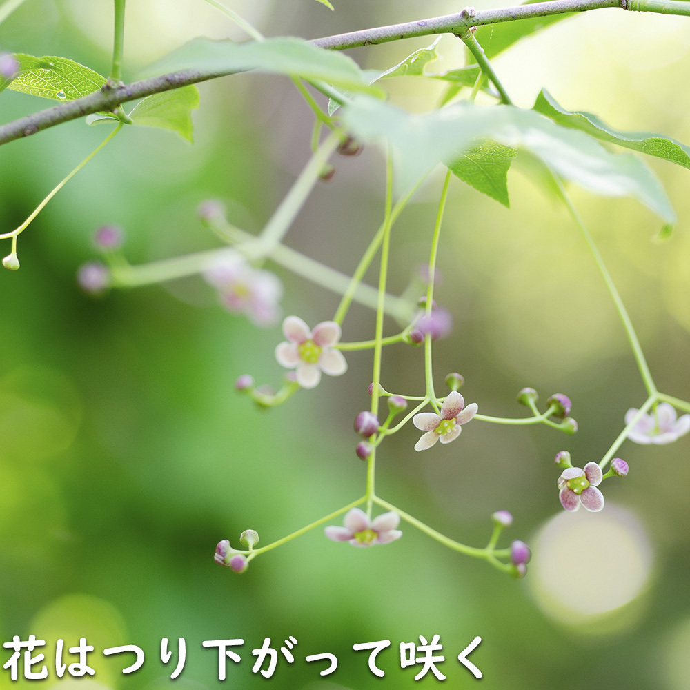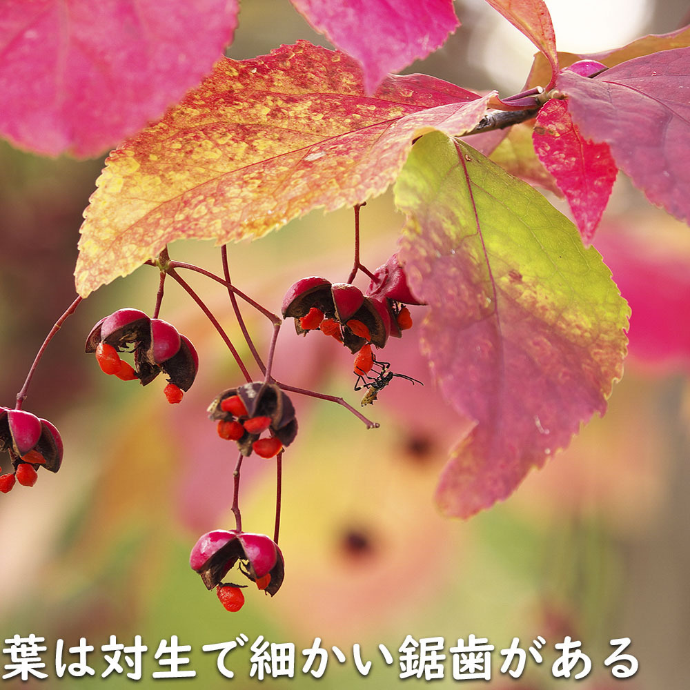 【商品情報】ツリバナは3.5mになる落葉低木です。日本が原産です。葉は対生し卵形で縁には鋸歯があります。花は両性花で淡い紫色の花を垂れ下がるように咲かせます。幹は果実は枝にぶら下がってなり熟すと割れて赤い種子が露わになります。水辺に自生し水をよく好む樹種です。花の中央部は花托の一部が肥大化した花盤と呼ばれる構造を持っています。鳥媒花で熟した赤い種子は果皮から離れにくいです。四季折々違う姿を見せることから日本庭園利用されることもあります。