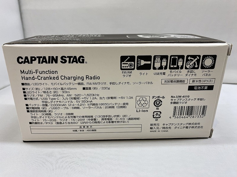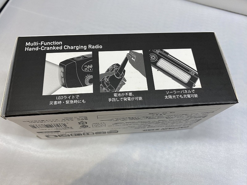機能:LEDライト、モバイルバッテリー、手回しダイナモ、ソーラーパネル、ラジオFM(76~90MHz)/AM(520~1,620KHz)
