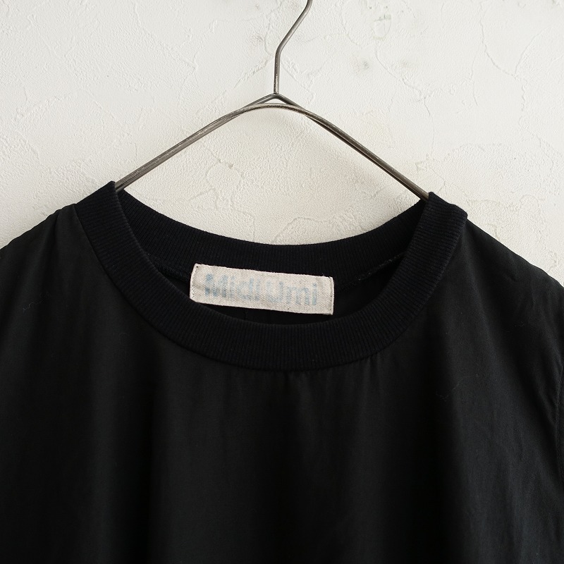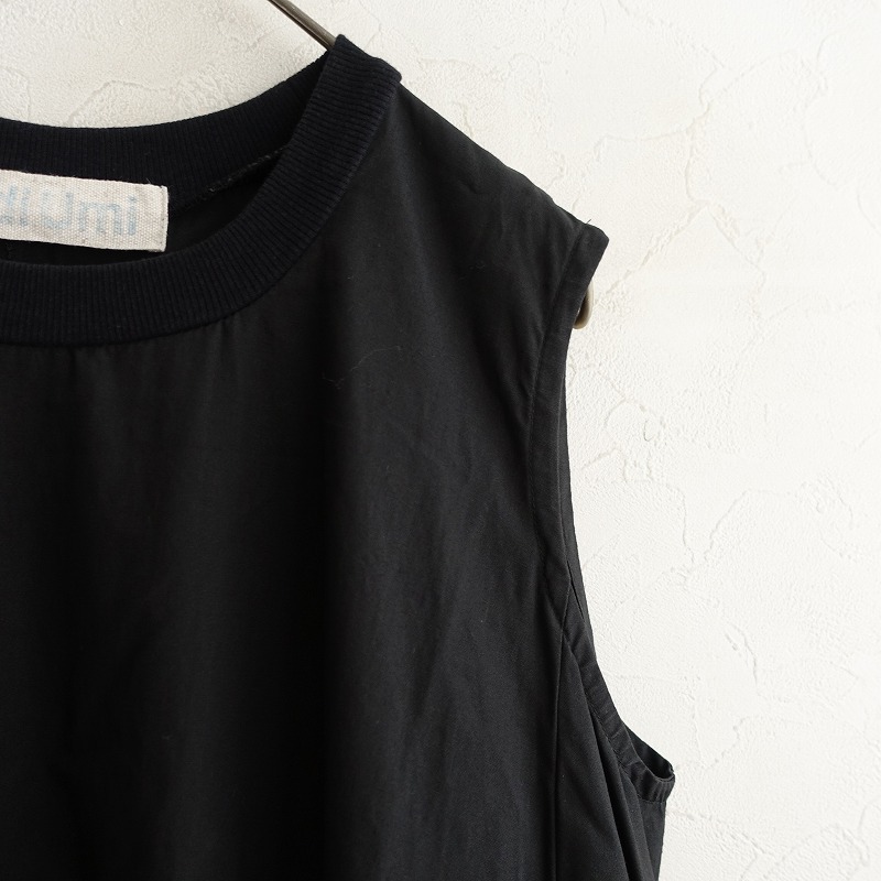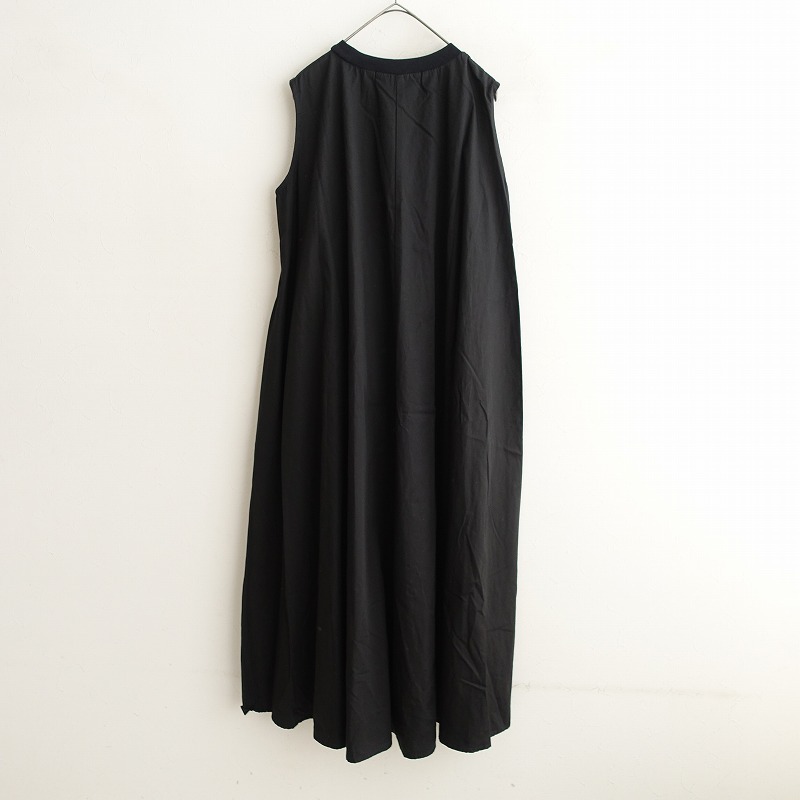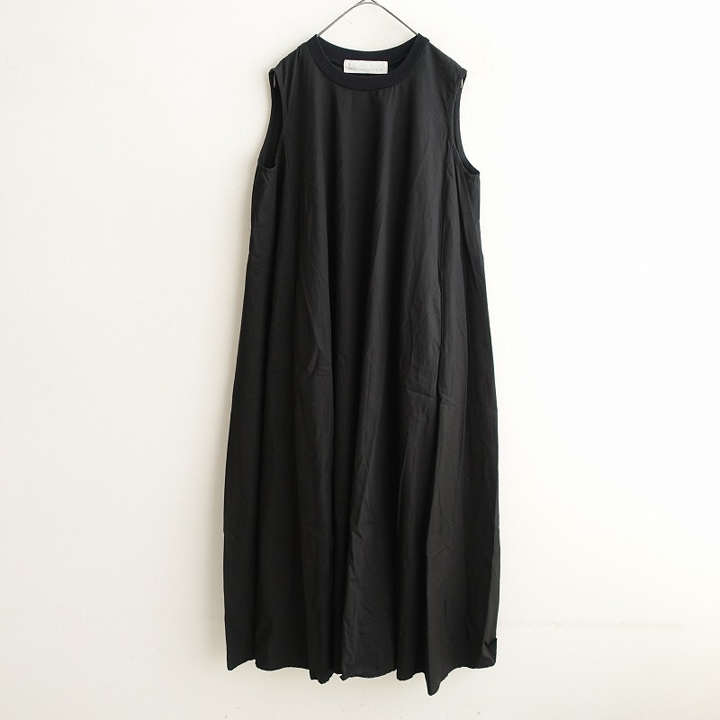 MidiUmiのノースリーブプレンティワンピースです。カラーはブラックです。綿麻の密に織られたウェザー生地を使用。麻のナチュラルな風合いとハリ感があり、透け感はございません。リブニットを使ったクルーネックがポイント。裾に大きく広がったロングワンピースです。両サイドにシームポケットがございます。 |