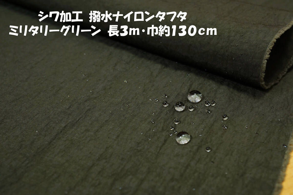 *シワ加工/撥水ナイロンタフタ ミリタリーグリーン 微薄ややソフト微光沢 長3m巾130cm タフタジャケット タフタコート ワンピース パンツ