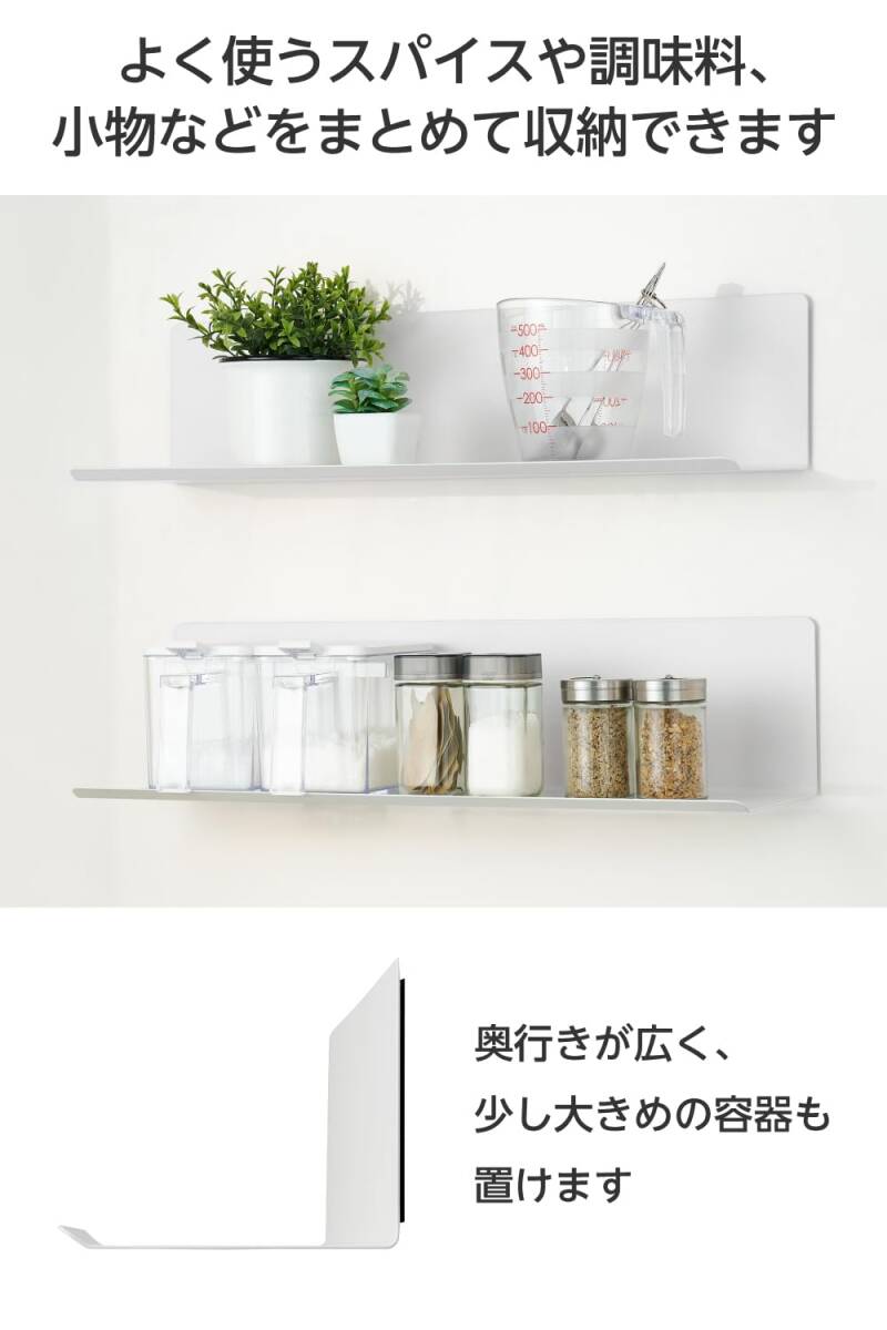 【 仕様 】 ■サイズ:幅約500mm×奥行約140mm×高さ約120mm ■材質:スチール、マグネット、シリコン ■重量:1.4kg ■耐荷重:約4kg ■内容物:ウォールラック本体 ■カラー:ホワイト 【 説明 】 ■よく使うスや調味料、小物などをまとめて収納できる、ウォールラックです。 ■壁面や冷蔵庫の側面などにマグネットで簡単に取り付け可能。デッドスペースを有効活用することで、キッチンの作業スペースが広がります。 ■取りやすい場所に置くことで、必要なときにさっと取り出せて便利です。 ■取っ手付きの調味料などを入れた容器も、持ち上げることなくスムーズに取り出せます。 ■前面の縁は緩やかに上向きになっていて、置いたものが滑り落ちにくいです。 ■奥行きが広く、少し大きめの容器や缶も置けます。 ■隅まで拭き掃除がしやすいフラットタイプ。調味料の液だれや粉末が散ってもすぐに拭けるので、きれいな状態を保てます。 ■シンプルなホワイトカラーとマットな質感で、幅広いインテリアに馴染みます。 ■当製品と、当社シリーズ製品にあるスラックを2つ並べた全長・幅が一緒なので統一感がでてキッチンツールをおしゃれに収納できます。(型番:KAWSPSLMGAWH) ■※浴室などの水に濡れる場所では使用しないでください。 ■※火災の原因となるため、コンロの近くで使用する際は可燃性のものを絶対に収納しないでください。 ■※冷蔵庫の側面は構造上、高温になる場合がありますので、熱に弱いものの収納は避けてください。 ■自社環境認定基準を1つ以上満たし、『THINK ECOLOGY』マークを表示した製品です。 ■廃棄物削減に取り組み、製品に同梱する取扱説明書等をペーパーレス化した製品です。