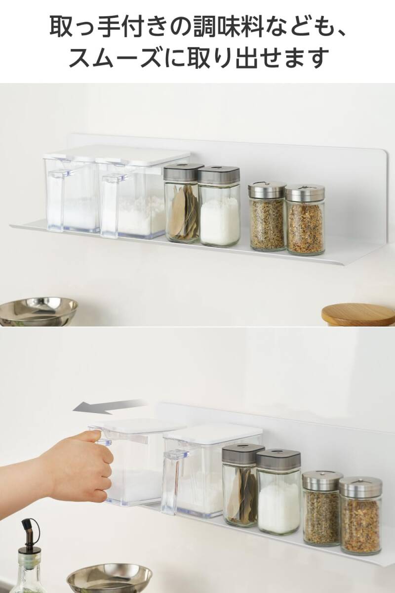 ・取っ手付きの調味料などを入れた容器も、持ち上げることなくスムーズに取り出せます。