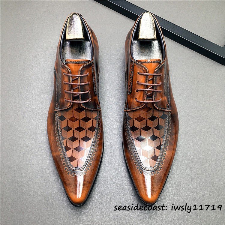 定価9万■入手困難 本革 レザーシューズ チェック柄 職人手作り ビジネスシューズ メンズ 牛革紳士靴 革靴 ドレスシューズ ブラウン 24.0cm