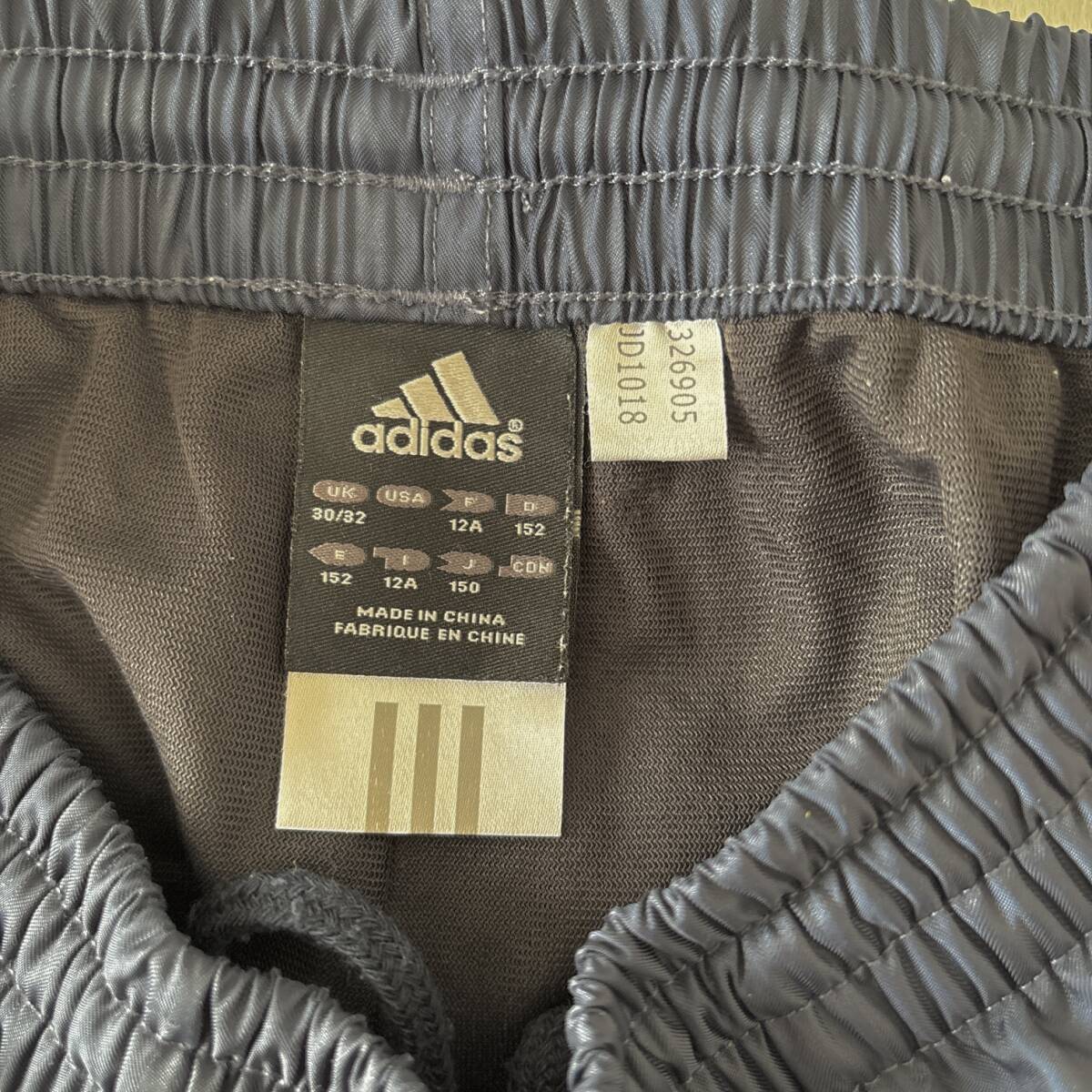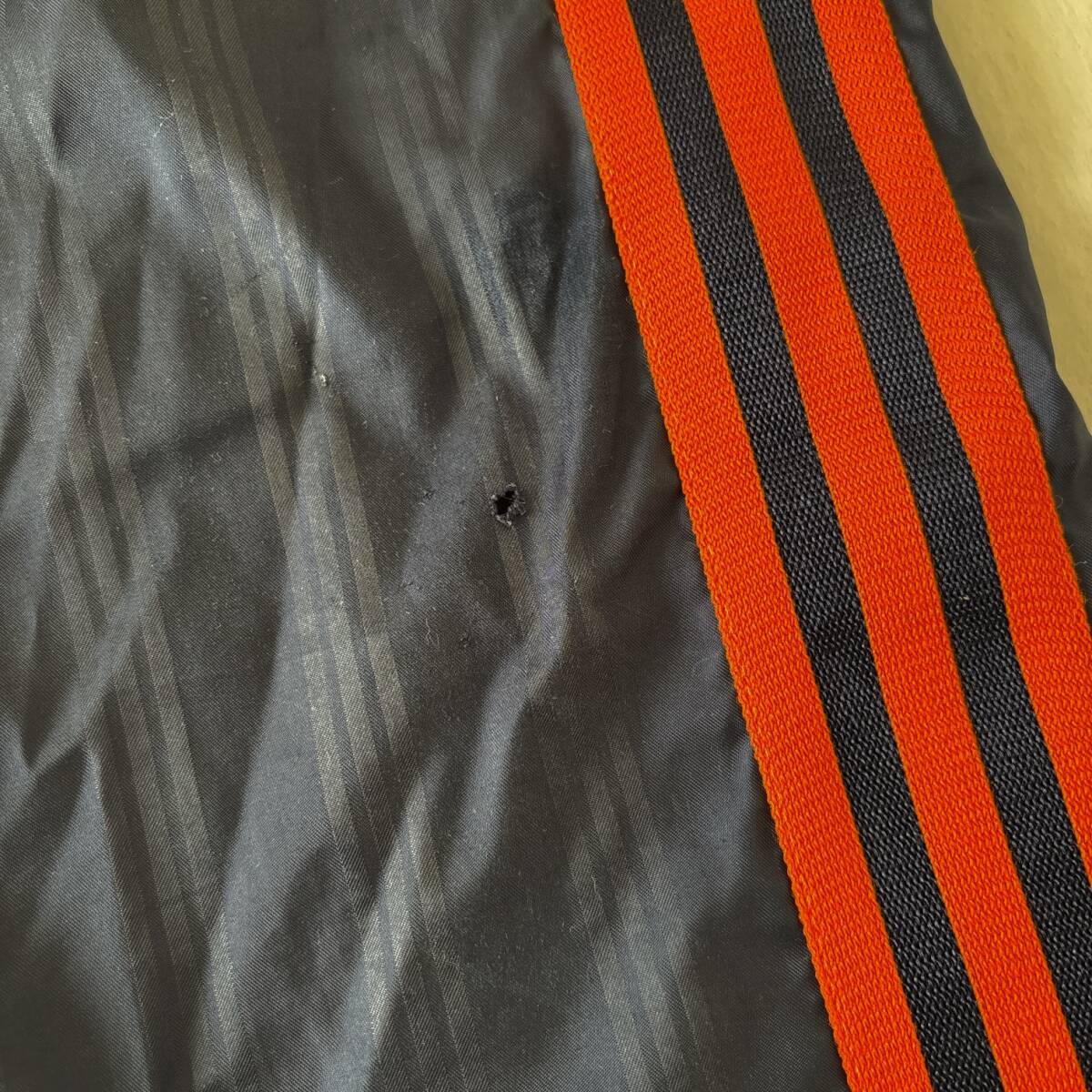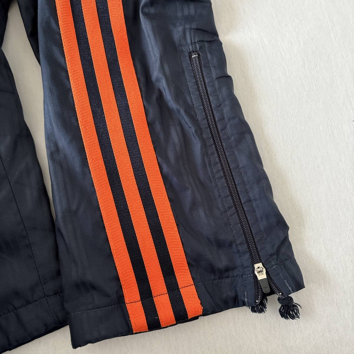 ○アディダスのラインシャカシャカパンツです。かっこいいネイビー×オレンジラインのデザインです。裾はファスナーとひもが付いています。全体にきれいな状態ですが、左膝あたりに3ミリほどの小さな引っかけた穴があります。