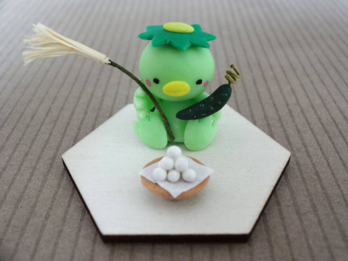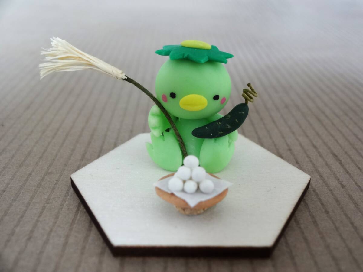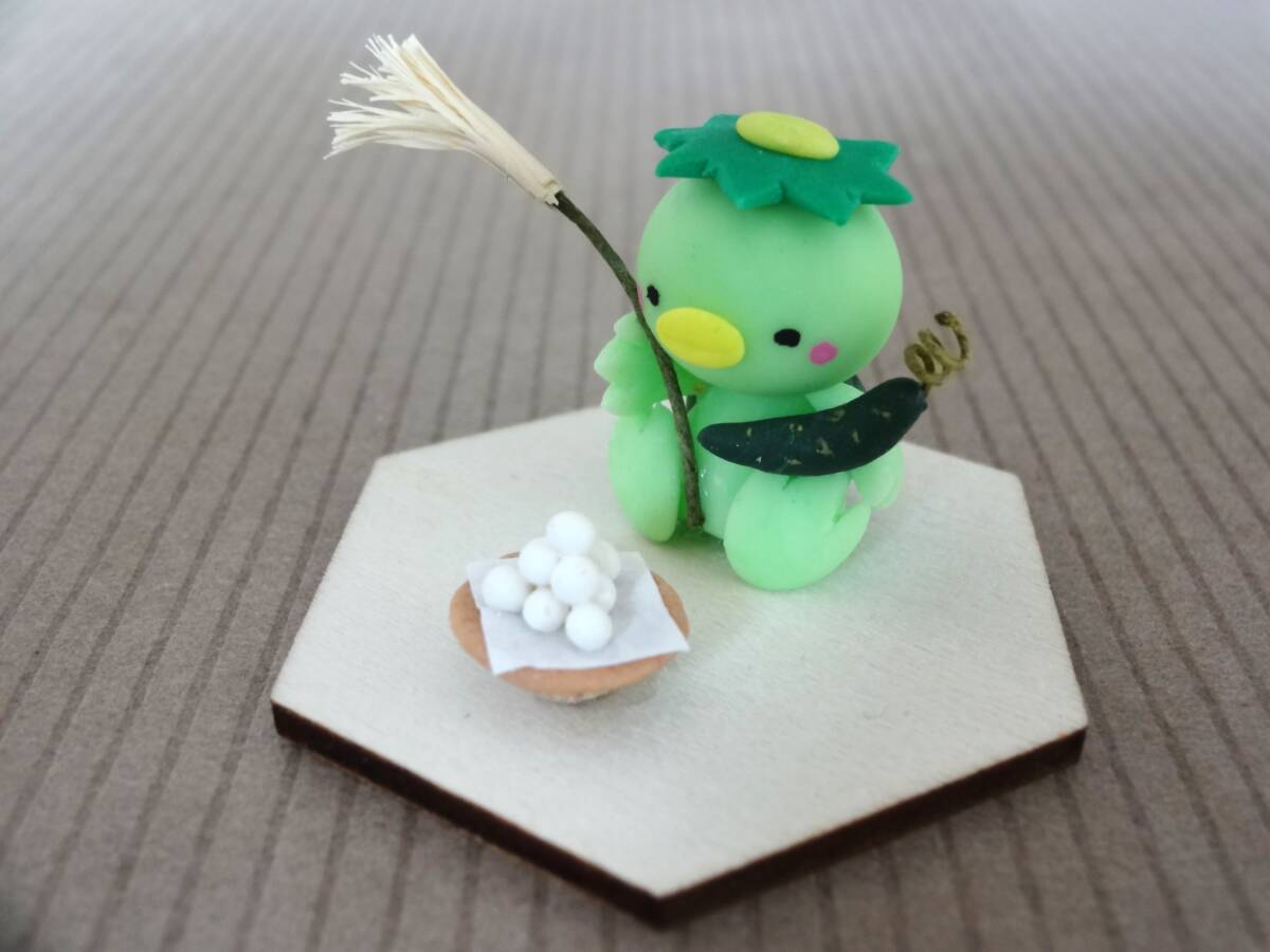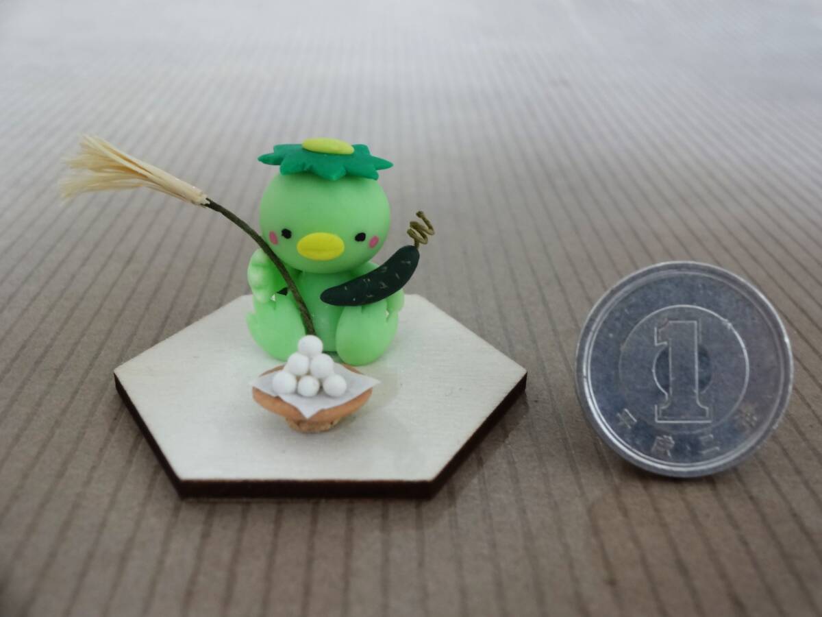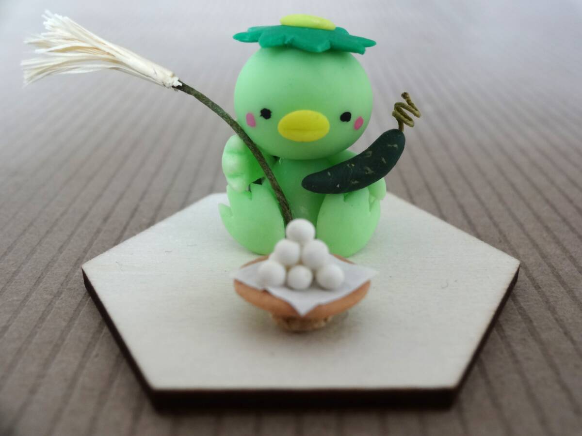 ミニチュア/樹脂粘土 /お月見 1/可愛いお月見かっぱ、お供え餅、ススキ、きゅうり持ち/六角形の白木の板のせ/シンプルでほっこり~♪