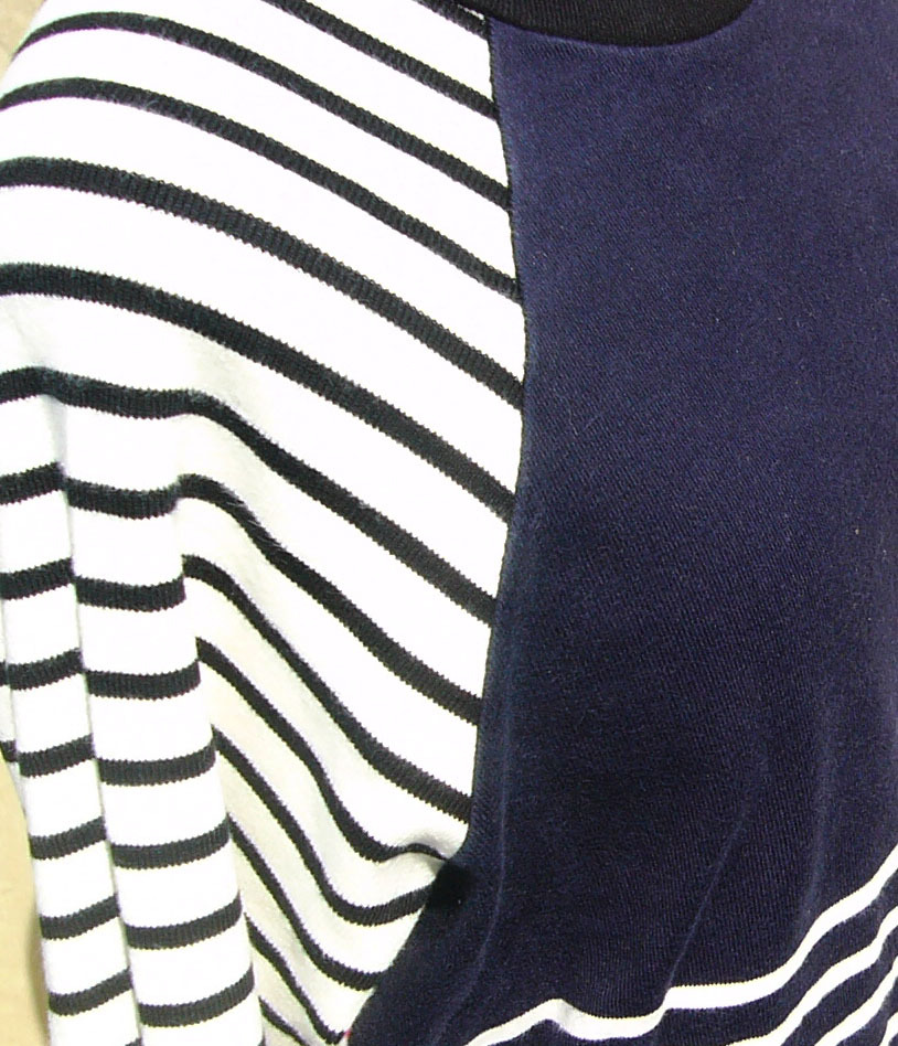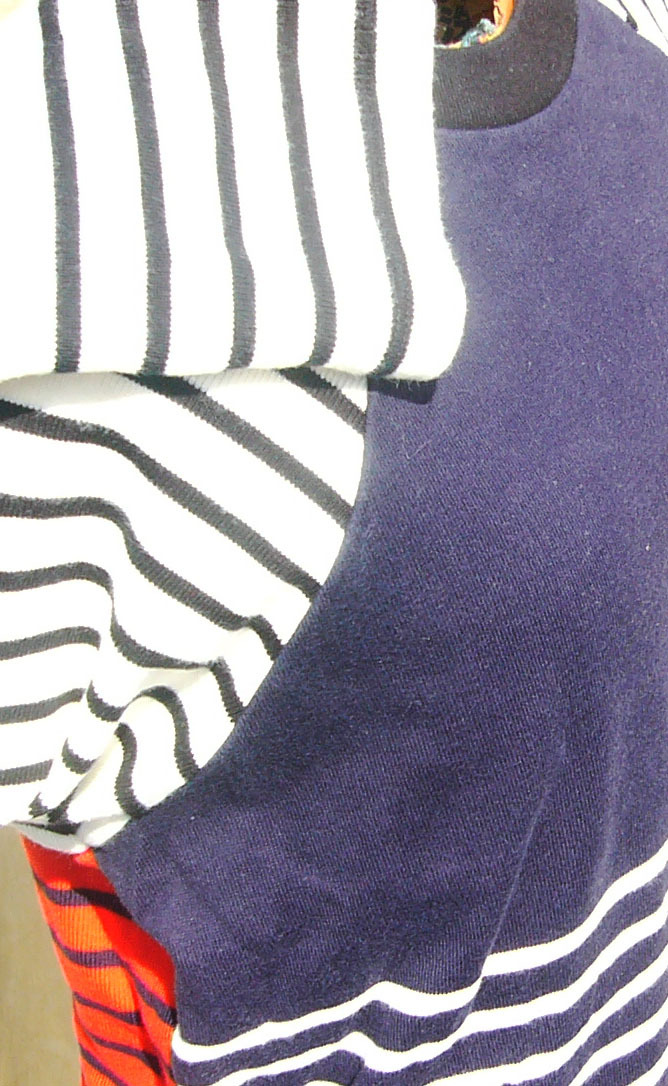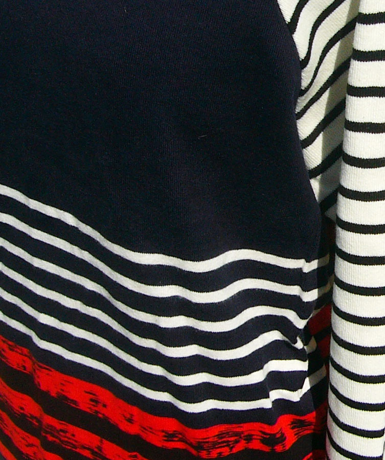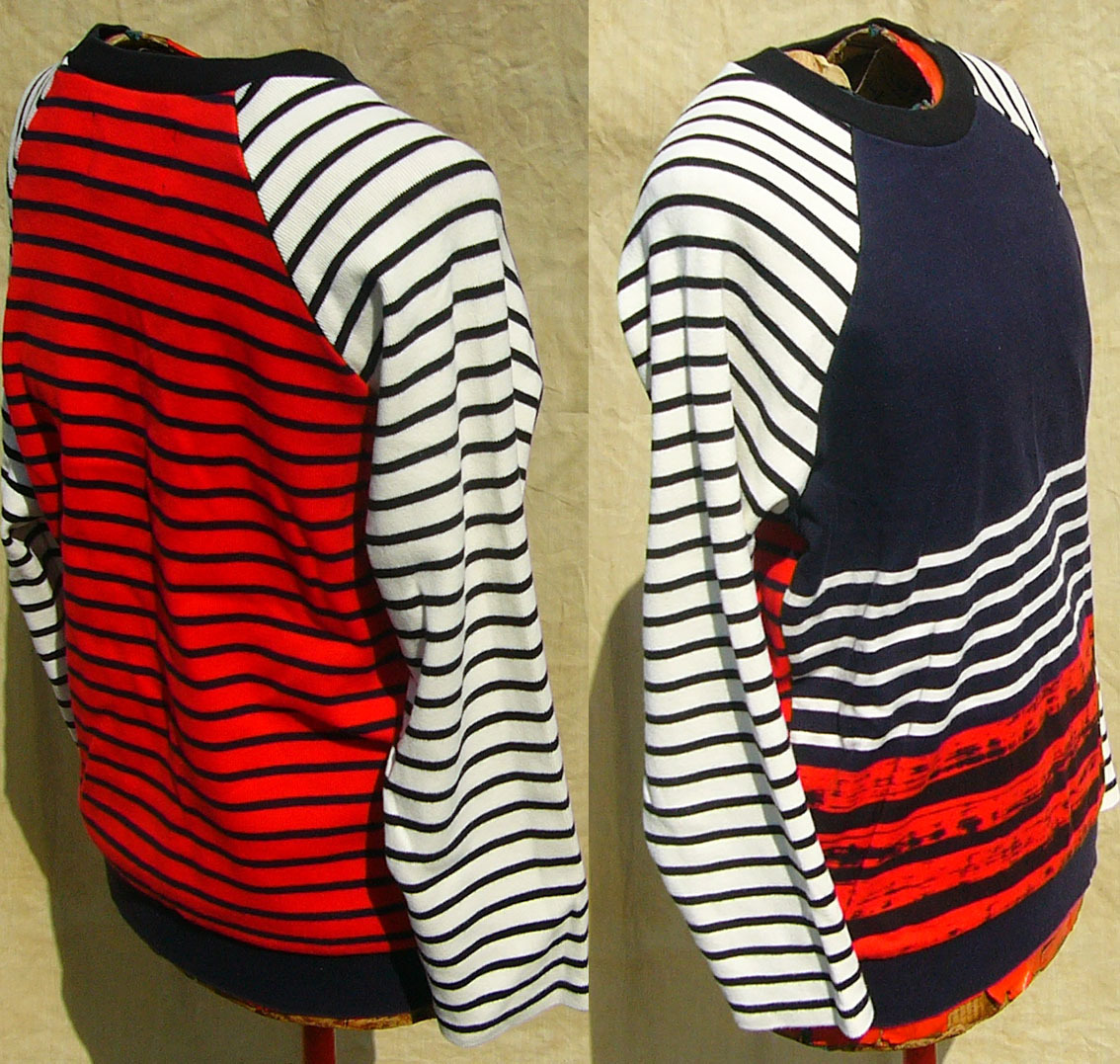 ネイビーと白にオレンジの逆襲 袖丈は8部丈ぐらい、レディースのブランドかと思ったのですが、サイズ的にはメンズのXSになります