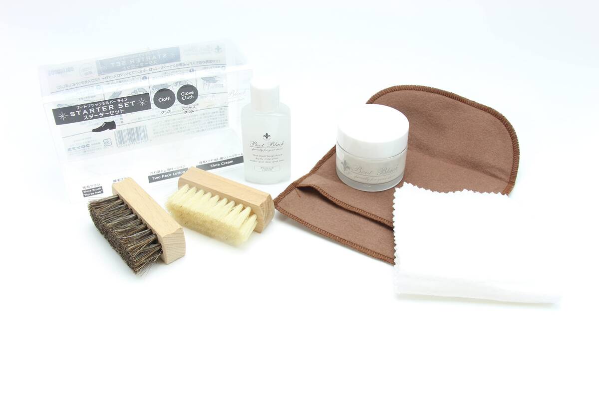 シュークリームとローションのほか、ブラシとクロスをそろえたセットです